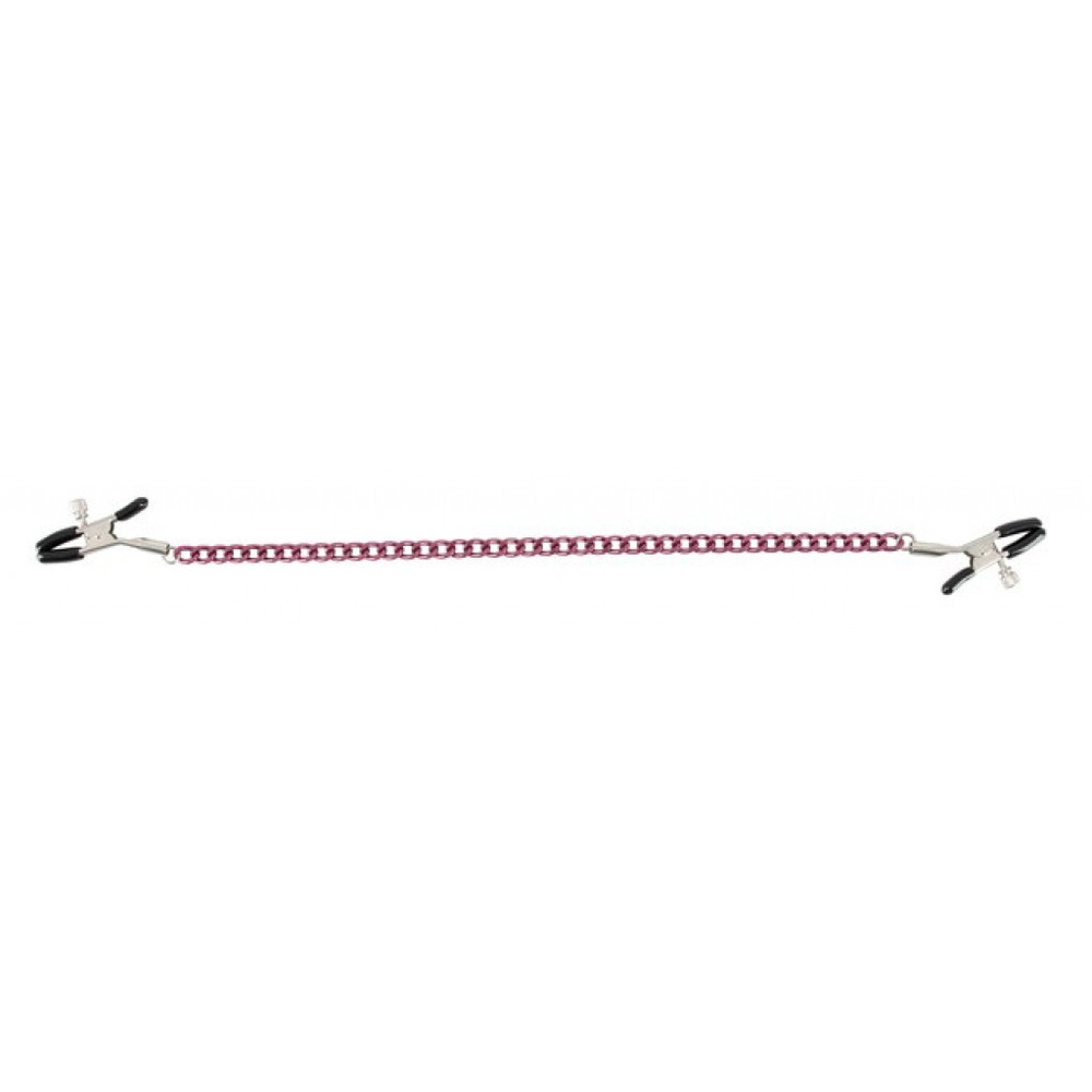 Two nipple clamps that are joined together by a purple chain. The pressure intensity of the clamps covered with rubber can be adjusted with the screws. Each clamp is 5.2 cm long, the chain is 30 cm long. Material: metal coating, PVC, phthalate-free according to EU Regulation REACH