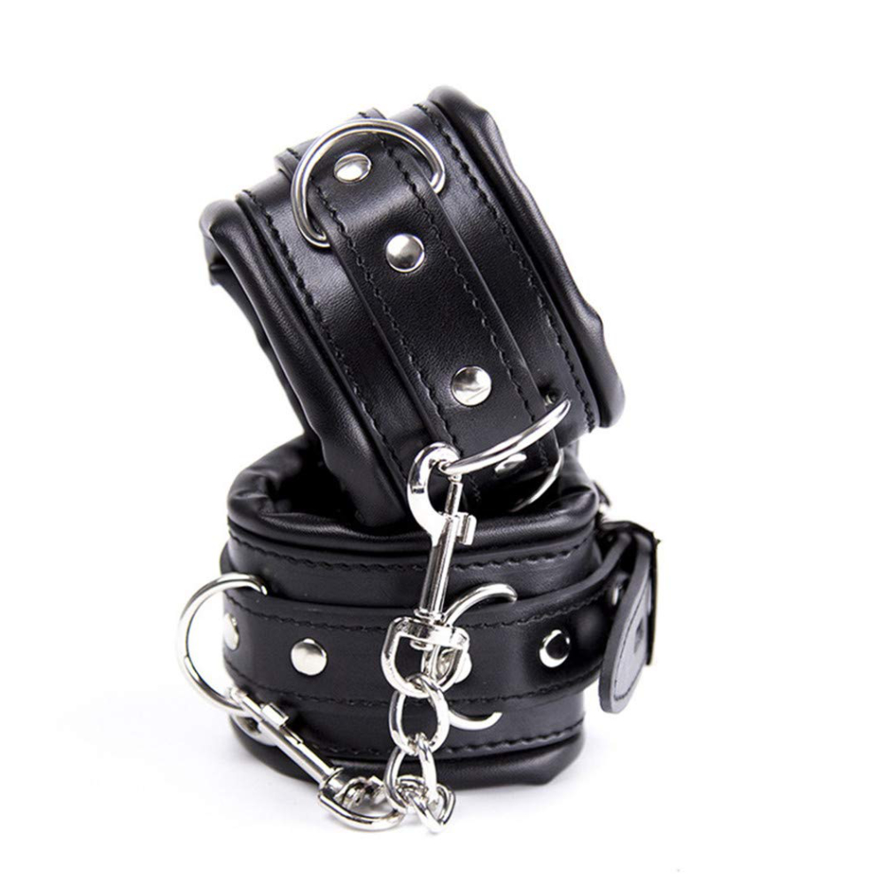 One size adjustable branded black leather wrist cuffs with soft padded leather inner surface so you can wear them tight with no pain. And they re built tuff so you can play hard, with a sturdy D-ring tie down and heavy duty buckle that can be padlocked closed around each wrist. Includes trigger hooks and chain.
