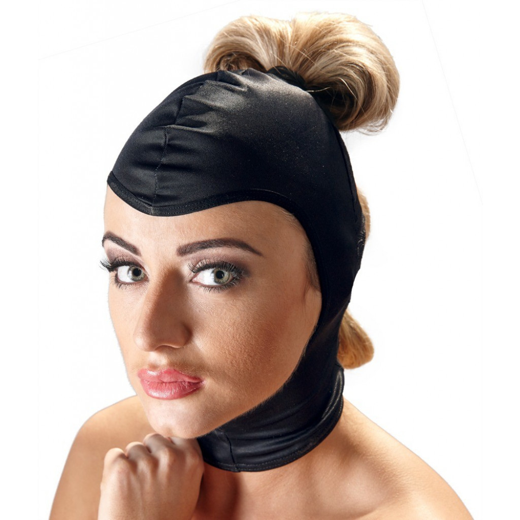 Super sexy stretchy black mask with face opening and with a hole for the ponytail.