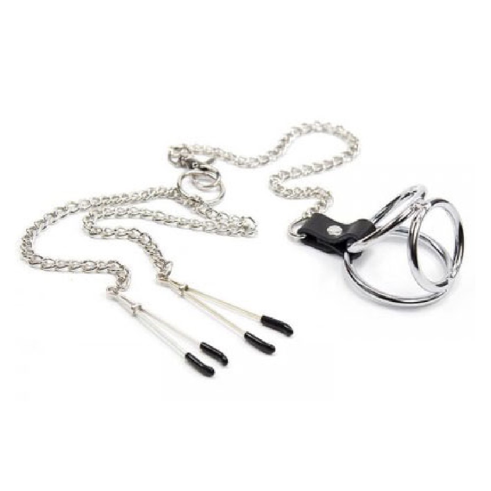 Metal Bondage cock ring and ball rings divider with chained pinch nipple clamps. Large triad cock and balls ring chamber with detouchable chained nipple pinching clamps.