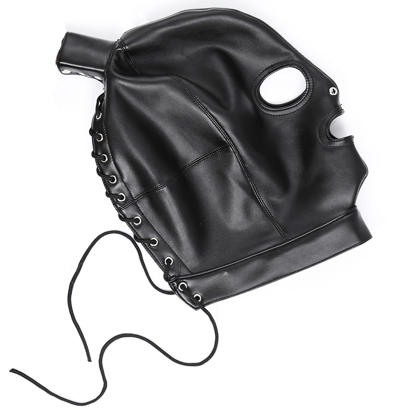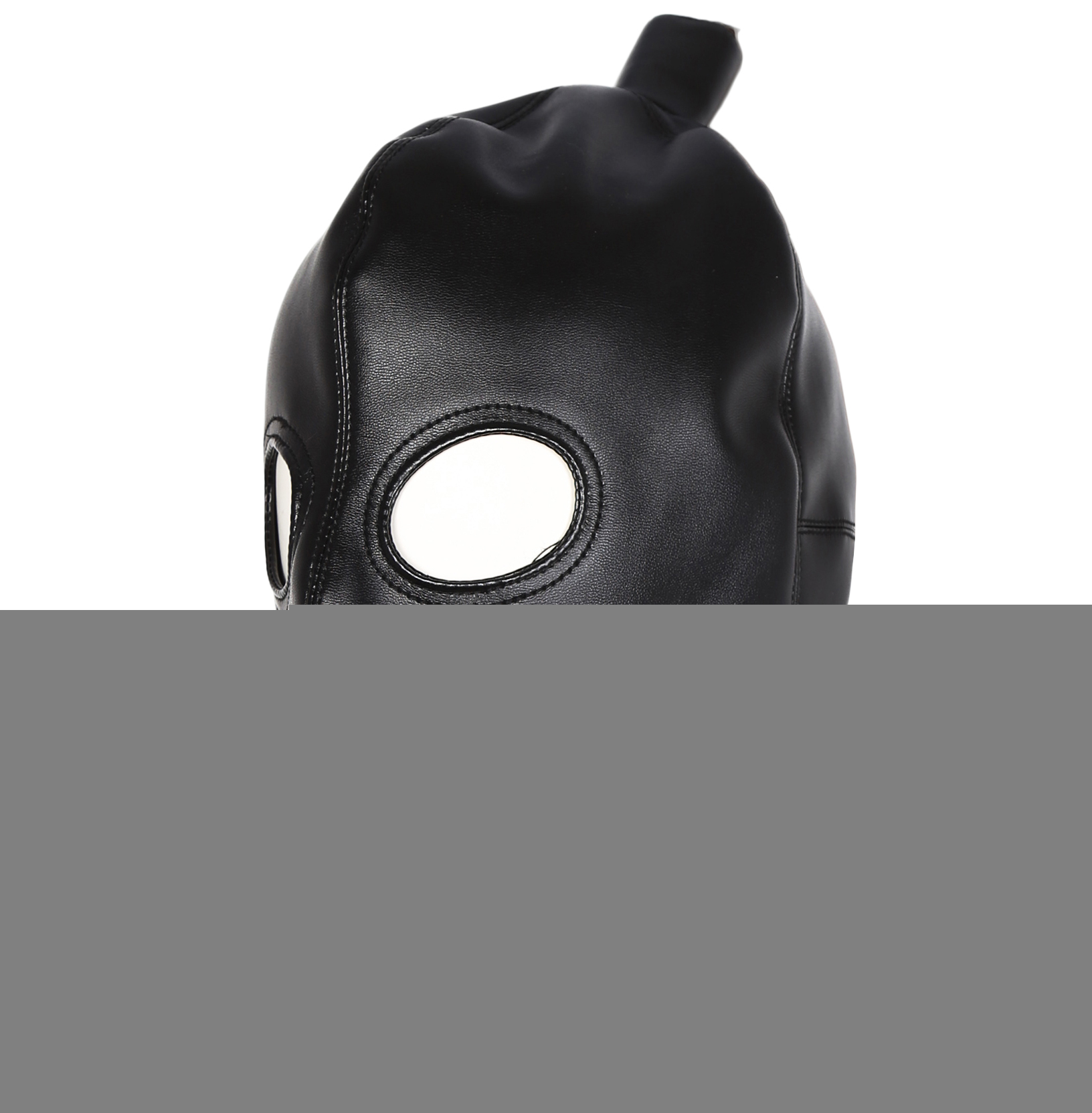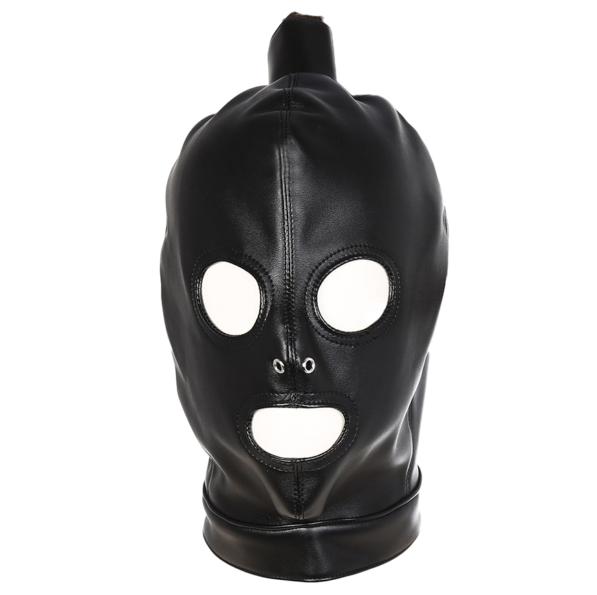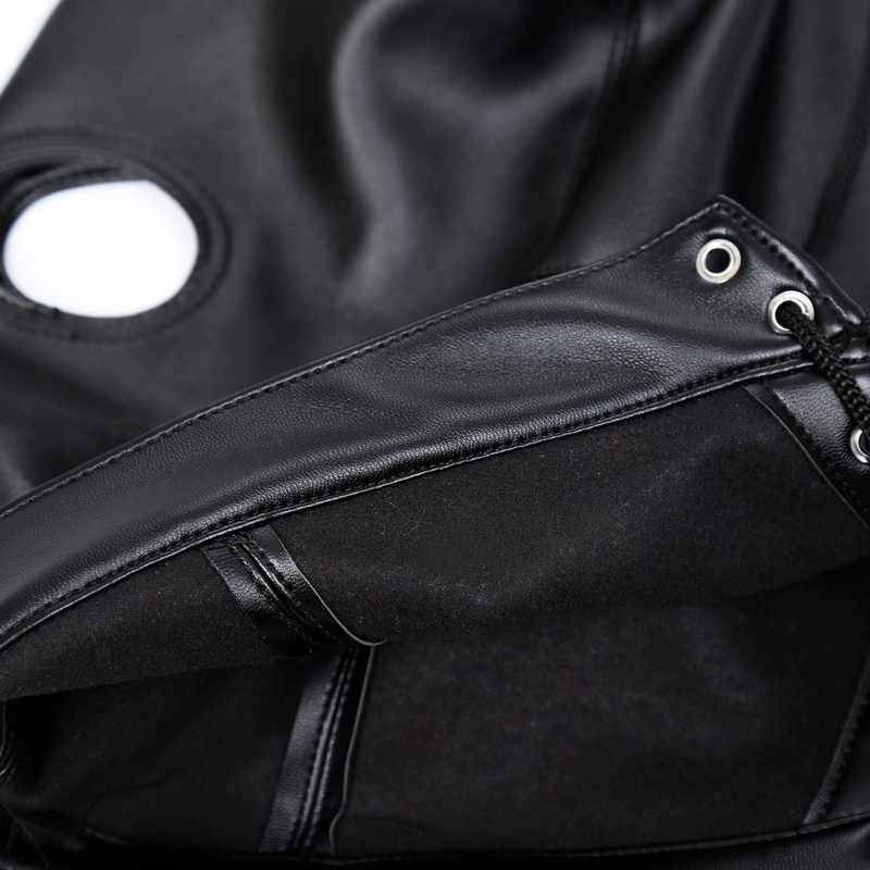 Bdsm leather Hood with mouth, eyes and ponytail opening by Naughty Toys. Unisex, one size with perfect fit. Made of high quality faux leather. Super sexy black mask with eyes and mouth openings and with a hole for your ponytail. The back of the mask has got thin elastic bands that tie up to your head.