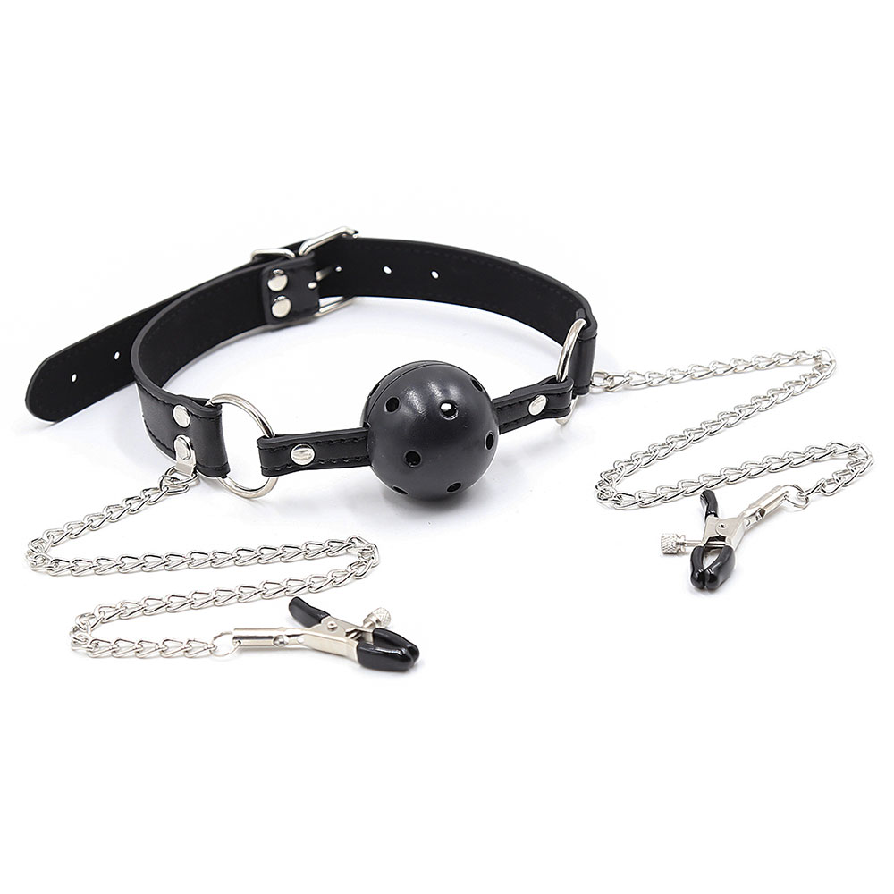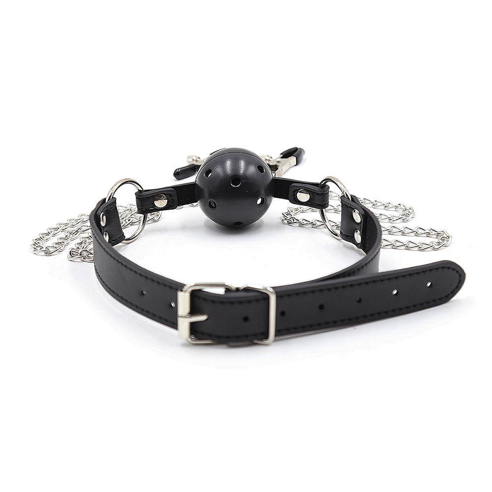 Naughty Toys adjustable breathable ball mouth gag with chained pressure adjustable nipple clamps. Take your BDSM pleasures to the next level with this breathable ball gag and nipple clamp set. Made from PVC and fully adjustable, use it to silence your lover and stimulate their nipples for utterly satisfying domination play.