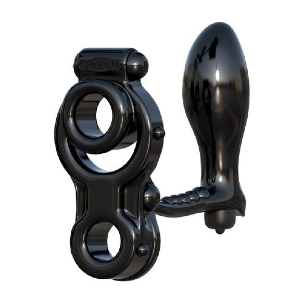 Push your package out to its maximum potential and enjoy a super tight tug on your balls while the vibrating prostate plug makes you cum harder than ever before. The ball stretcher pulls down on your testicles and prevents them from retracting upward, delaying ejaculation and prolonging the fun. One bullet sits on the top ring for direct clitoral stimulation, one sits behind your boys for an incredible ball buzz, and one bullet sits inside the prostate plug for wall-banging backdoor bliss.