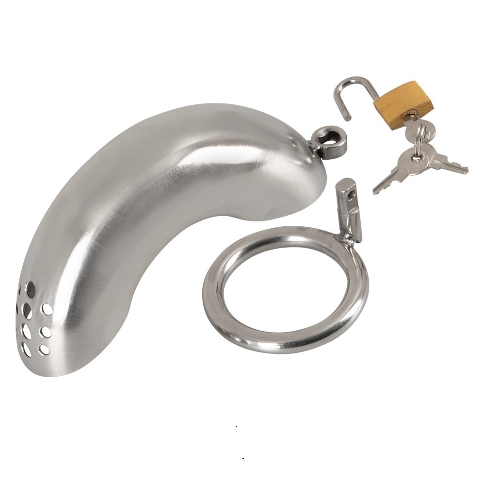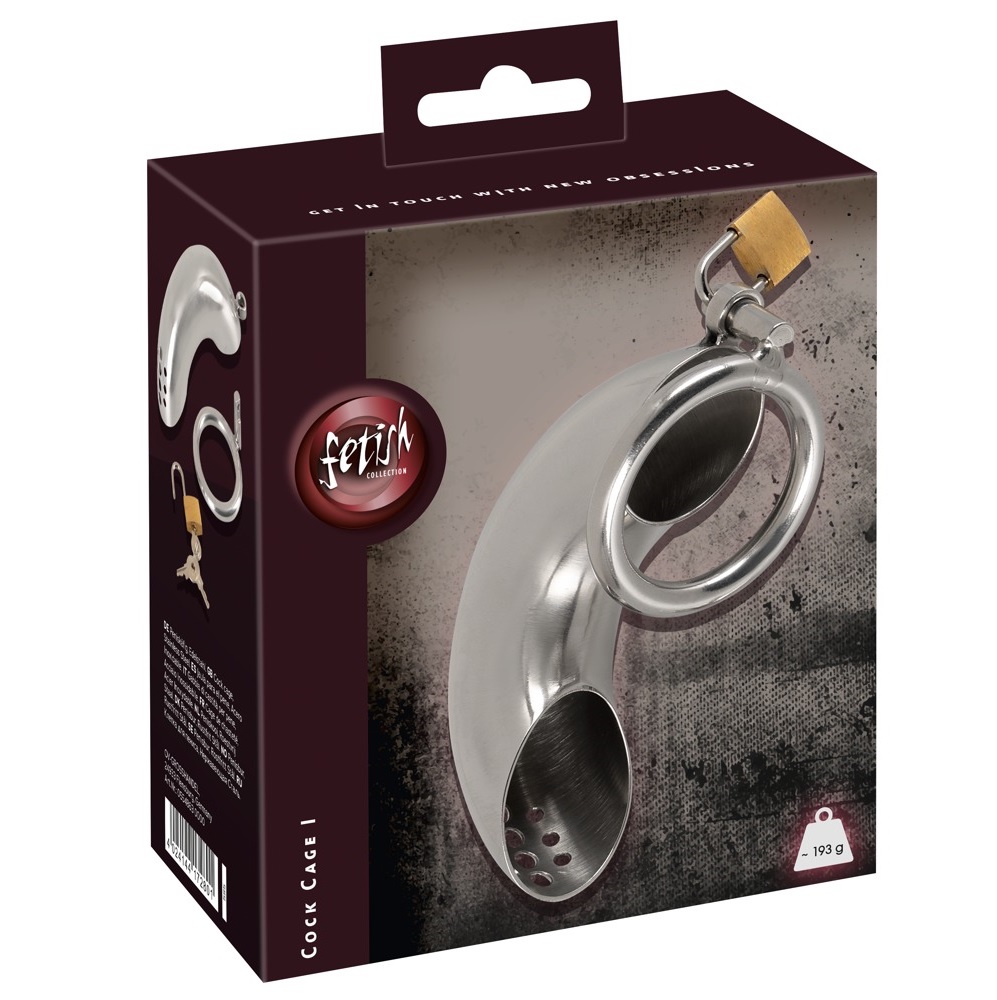The cock cage is easy to put on and take off: The non-erect penis goes into the (mean) curved cage and the steel ring is placed around the testicles. The cage can be locked with the included lock (3 keys included).