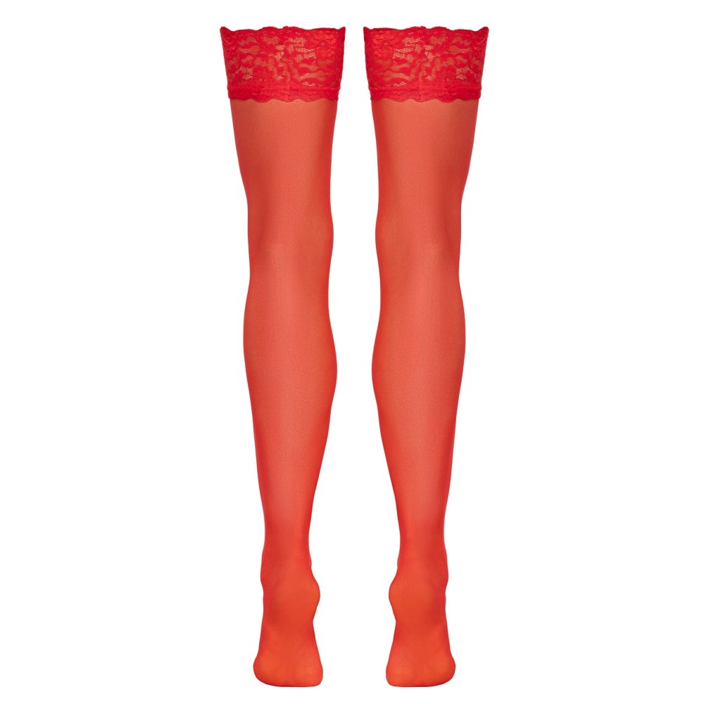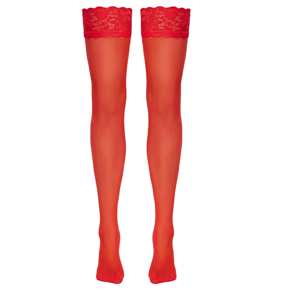 The velvety soft, red stockings from Cottelli LEGWARE have stretchy 9 cm wide lace around the top. 20 denier. Oeko-Tex certified.