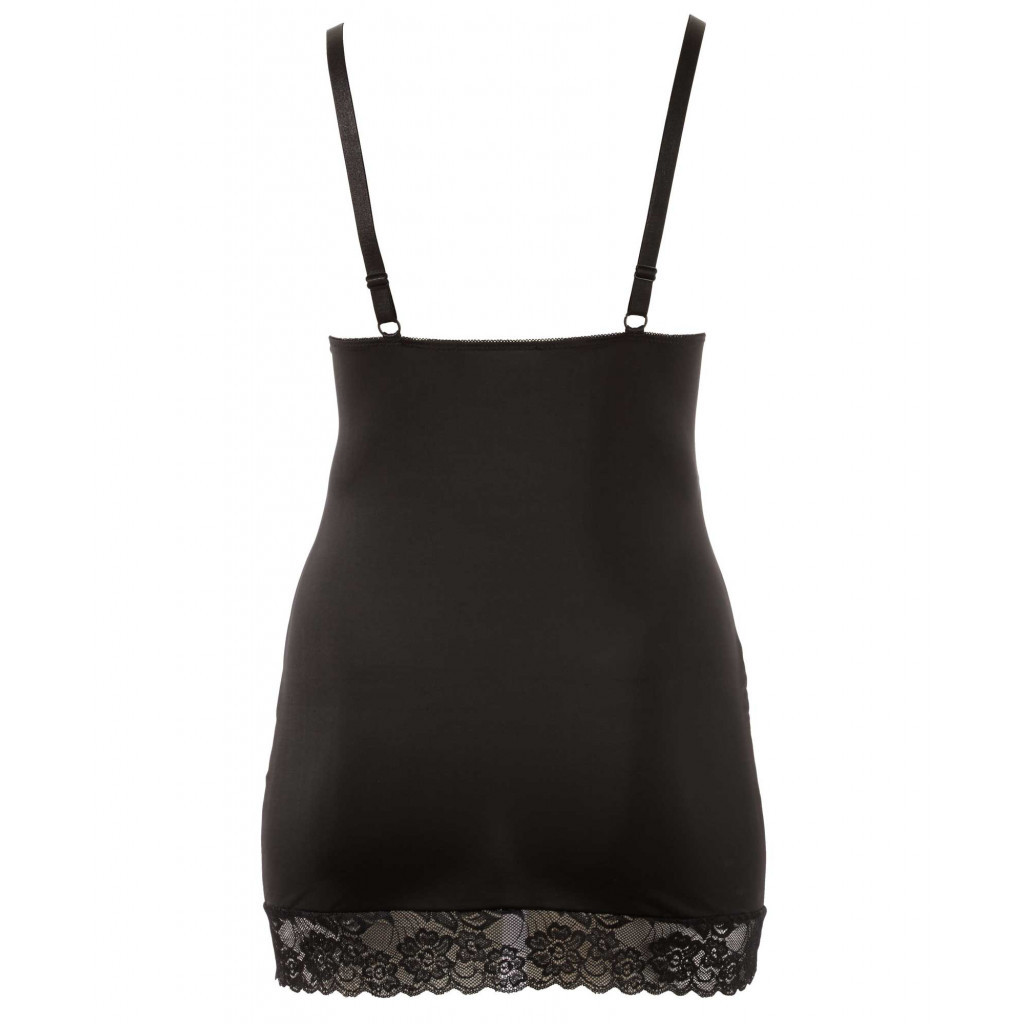 Black transparent lingerie dress with adjustable straps and lace decoration. The back of the dress is classic and simple.
