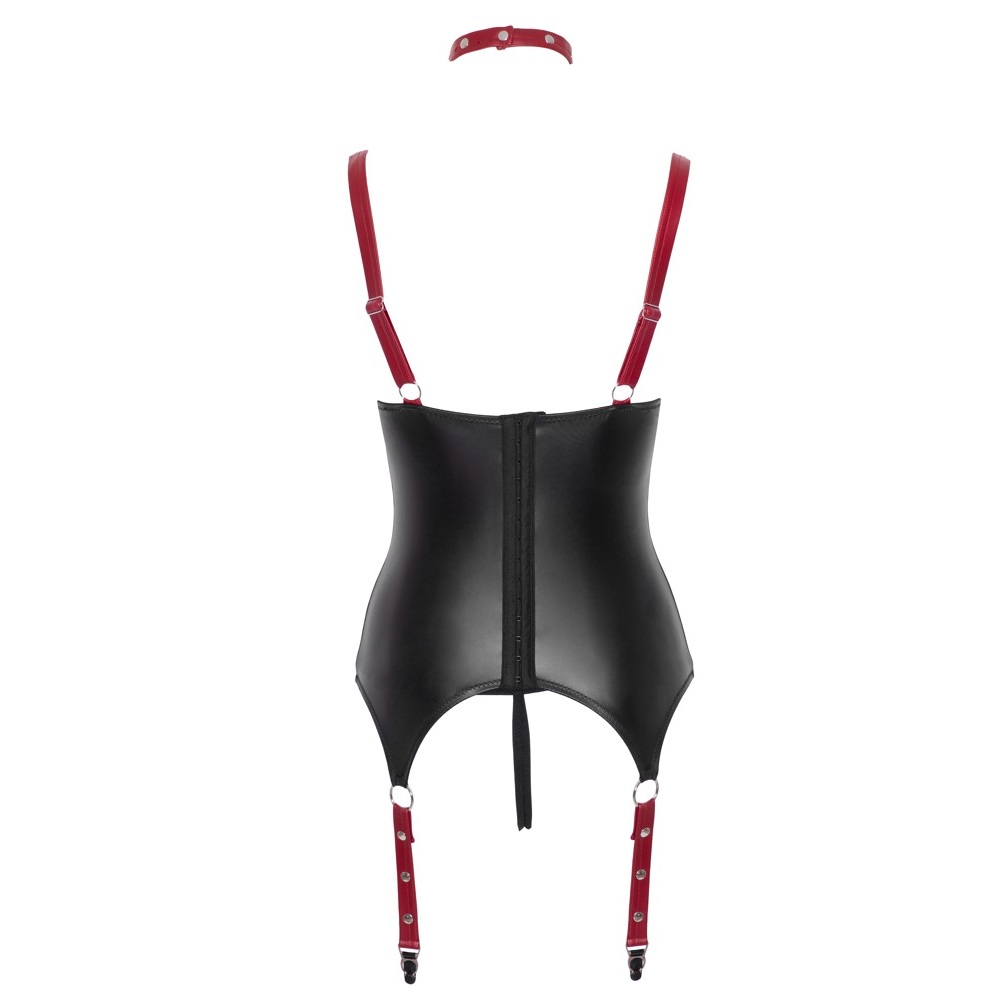 Revealing basque and crotchless string from Cottelli BONDAGE made out of beautiful, stretchy matte look material with bra straps, suspender straps and a waist strap (only at the front) in red material with studs. The basque has underwired shelf bra cups and a hook fastener at the back. The bra and suspender straps can be adjusted for a perfect fit. The string is crotchless. The included collar and handcuffs are in a matching red colour. The collar has a ring at the front can be adjusted with the press studs. The simple handcuffs can be worn stylishly on the wrists so that the hands are tied at the front or the back of the body.