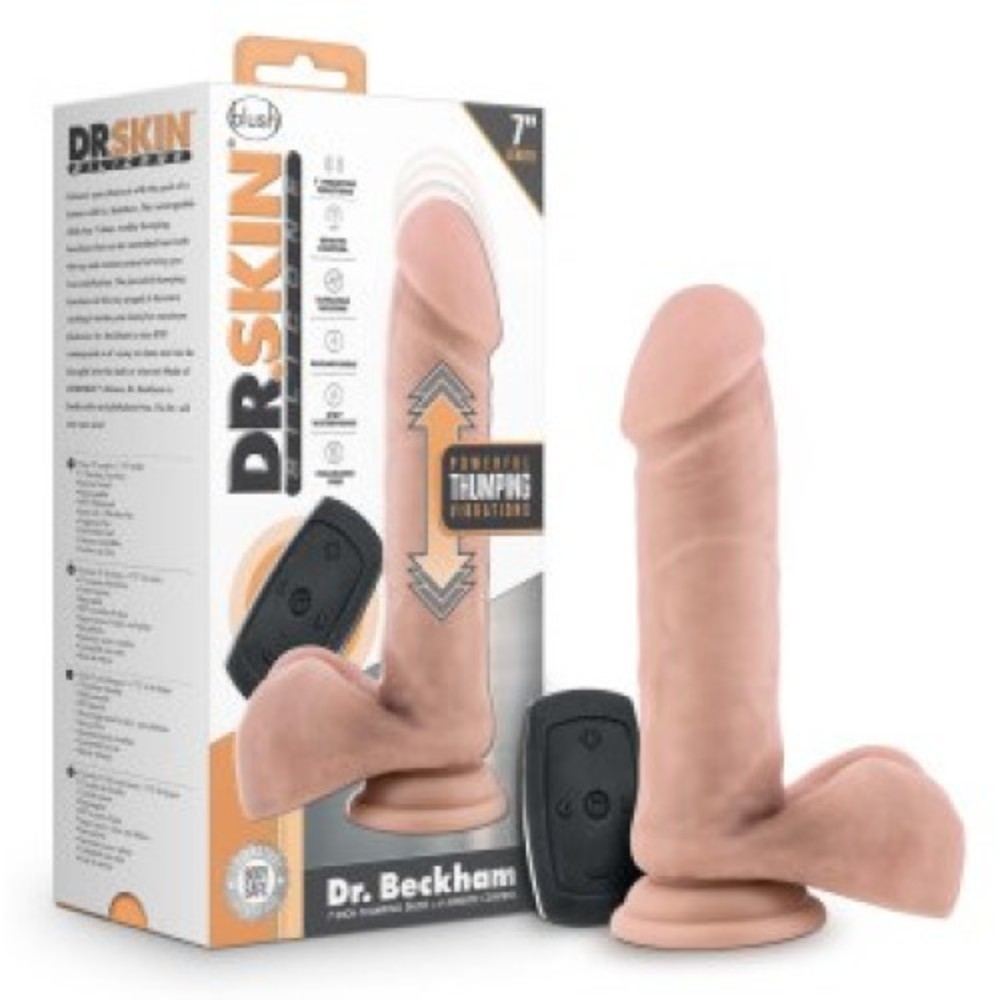 Enhance your pleasure with the push of a button with the DR SKIN Dr Beckham Thumping remote dildo Vanilla 19.6 x 4.4 cm. This rechargeable dildo has 7 powerful thumping functions that can be controlled from both the toy and remote control to bring you true satisfaction. The powerful thumping functions of this toy propel it forward, rocking it inside your body for maximum pleasure.