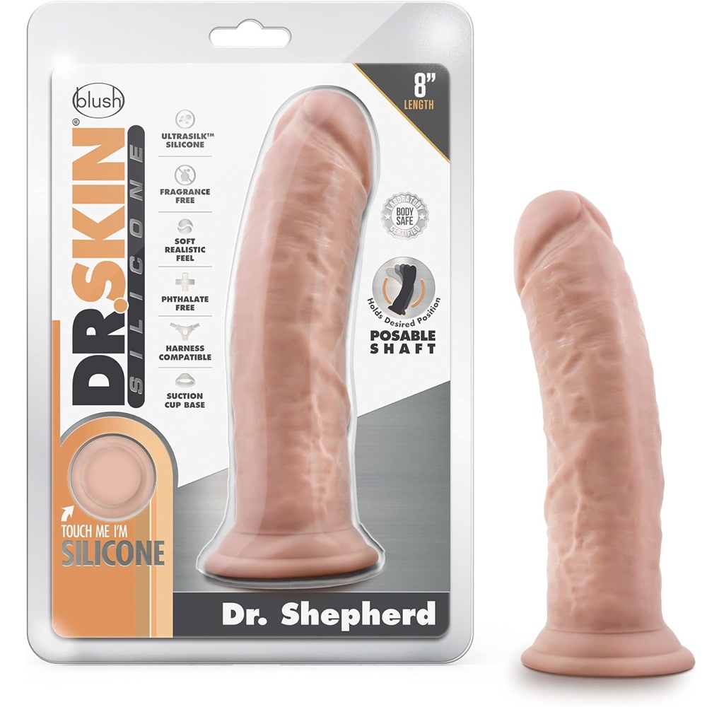 The doctor will see you now! Dr. Shepherd is meticulously crafted to look incredibly realistic. Built with a powerful suction cup, you can stick this Dr. Skin dildo to any smooth clean surface for solo play, or strap it into your harness for partnered fun. Dr. Shepherd has a posable shaft that contours and molds to your body, enhancing pleasure. Ultrasilk ® Smooth and Made of Puria™ Platinum-Cured Silicone, Dr. Shepherd is body-safe, phthalate free, latex free, fragrance free, and easy to clean.