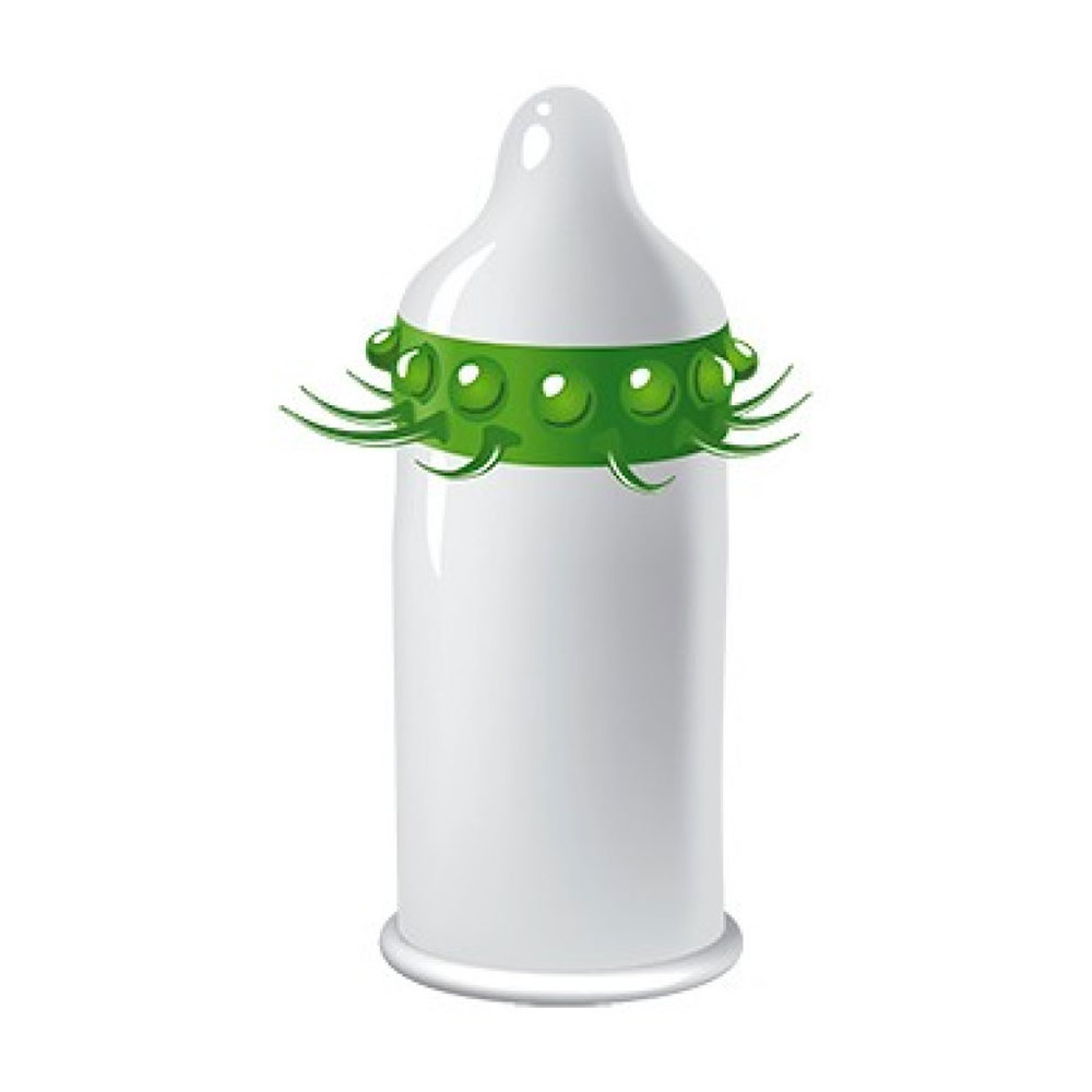 Extravagant latex condom for extravagant couples with soft, green line of spikes and beads surrounds the tip of the penis.