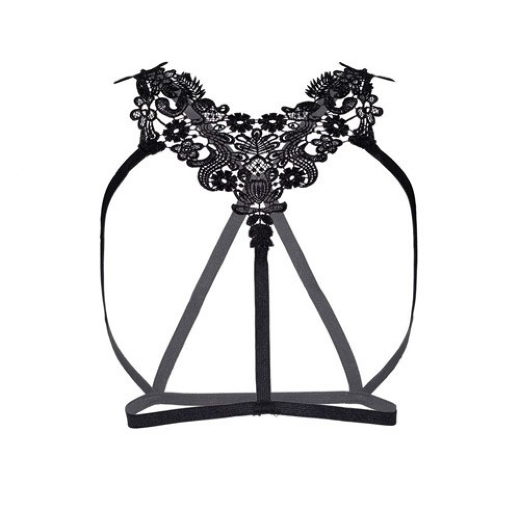 2 piece lingerie set includes the embroidered lace applique body harness with elastic straps.