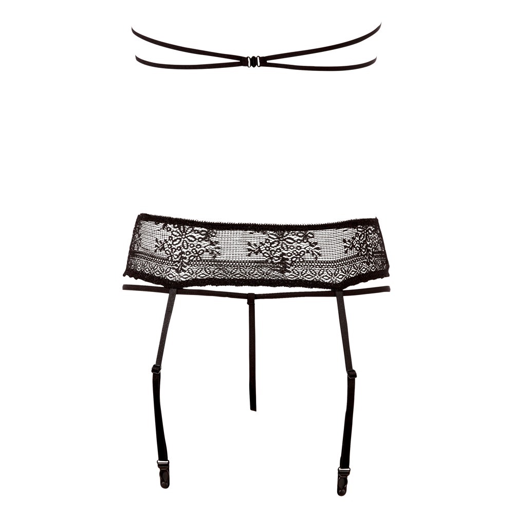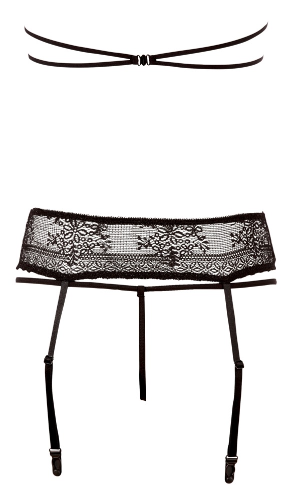 Attractive floral lace 3 pieces lingerie set. Wireless lace bra with high chocker (that closes at the back with 2 buttons) and a small rhinestone chain between the cups. Set also includes a matching string and a rhinestone decorated suspender belt with 4 adjustable straps.