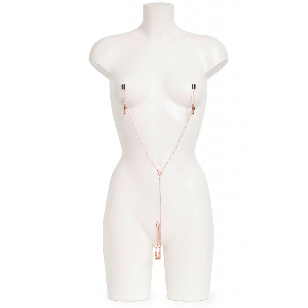 Fifty Shades of Grey All Sensation Nipple clamps with four decorative beads on them and a labia clamp. Chains join all the clamps together.
