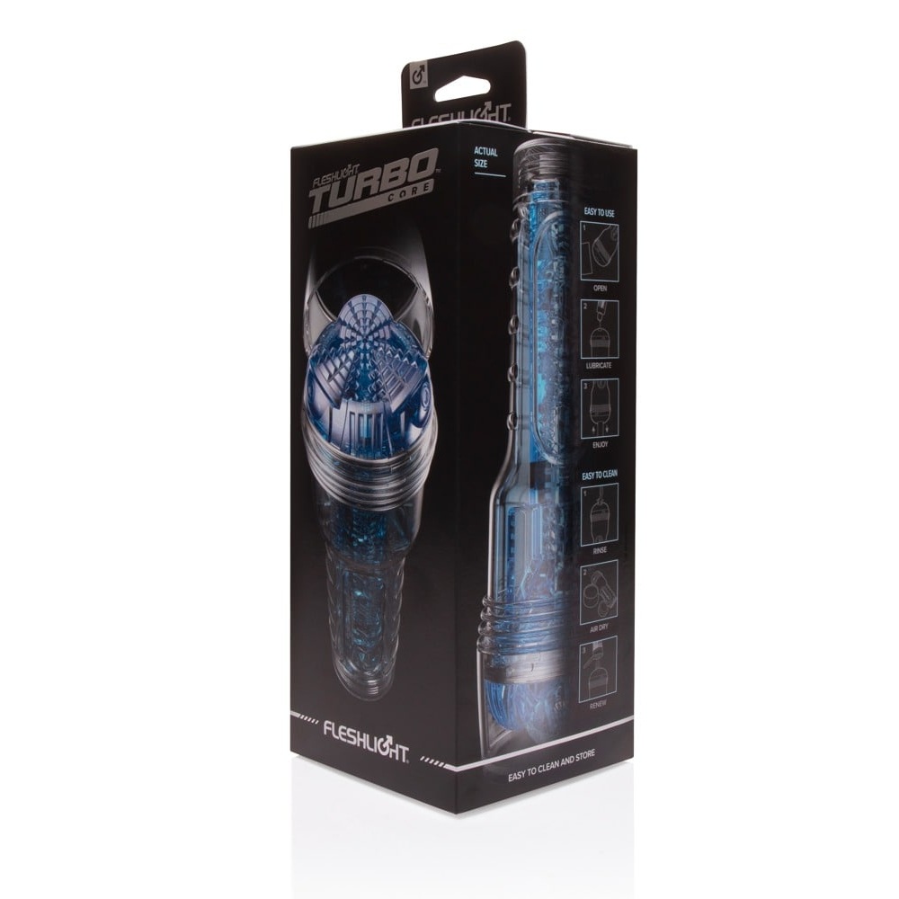 The new dimension of pleasure! Now in Cyprus the transparent blue masturbator Turbo Core from Fleshlight for the ultimate blow job feeling during a hand job. It has an innovative, textured hole that feels like a phenomenal deep throat when the penis is inserted. There are various stimulating textures inside the tight but flexible pleasure canal. There are also 2 rings inside the pleasure canal for an even tighter sensation. The masturbator can be removed from the case in a cool torch design for cleaning.