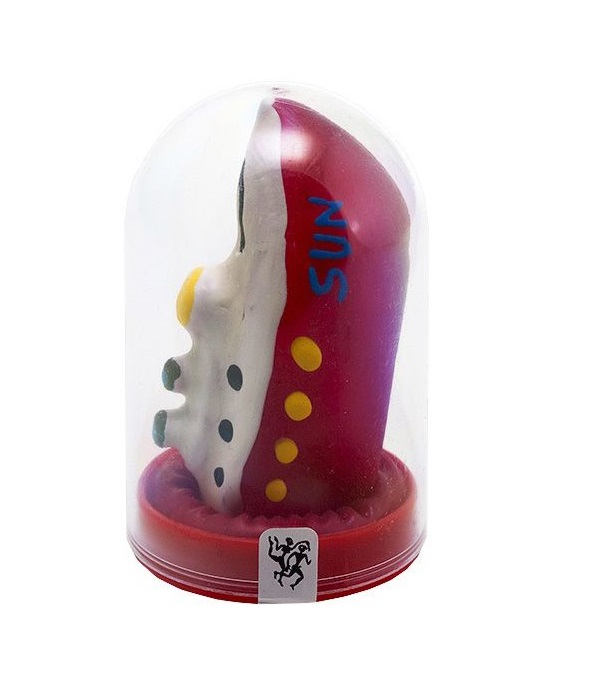 Hand-painted colored fantasy condom. This latex condom is completely unique, because it is hand-painted and hand-dipped. The hand-painted fantasy condom is for decoration or a joke but does not provide protection against pregnancy and/or STDs. Nice as a gift, on a vibrator, on the mantelpiece or in the collection of collectors. In short, wonderful nonsense, but in safe-sex education this fantasy condom attracts attention, breaks the ice and is a nice prize for an STD quiz, for example. PLEASE NOTE: SOLD AS NOVELTY ONLY. You cannot use this fantasy condom as a contraceptive. It has not been tested and there is therefore no guarantee of quality. Never use over a tested condom. For safe sex, only use a tested condom!
