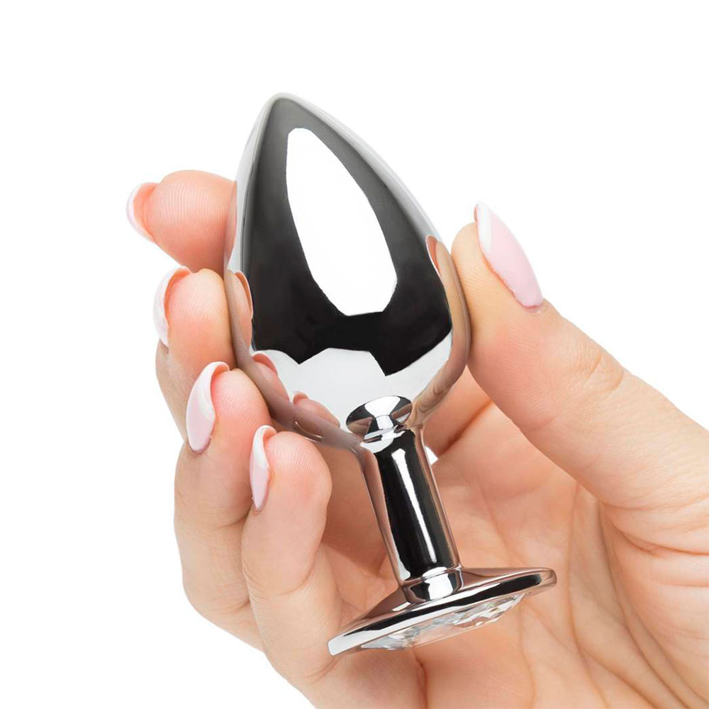 – Smooth metal butt plug with jewelled heart-shaped base for firm, filling sensations