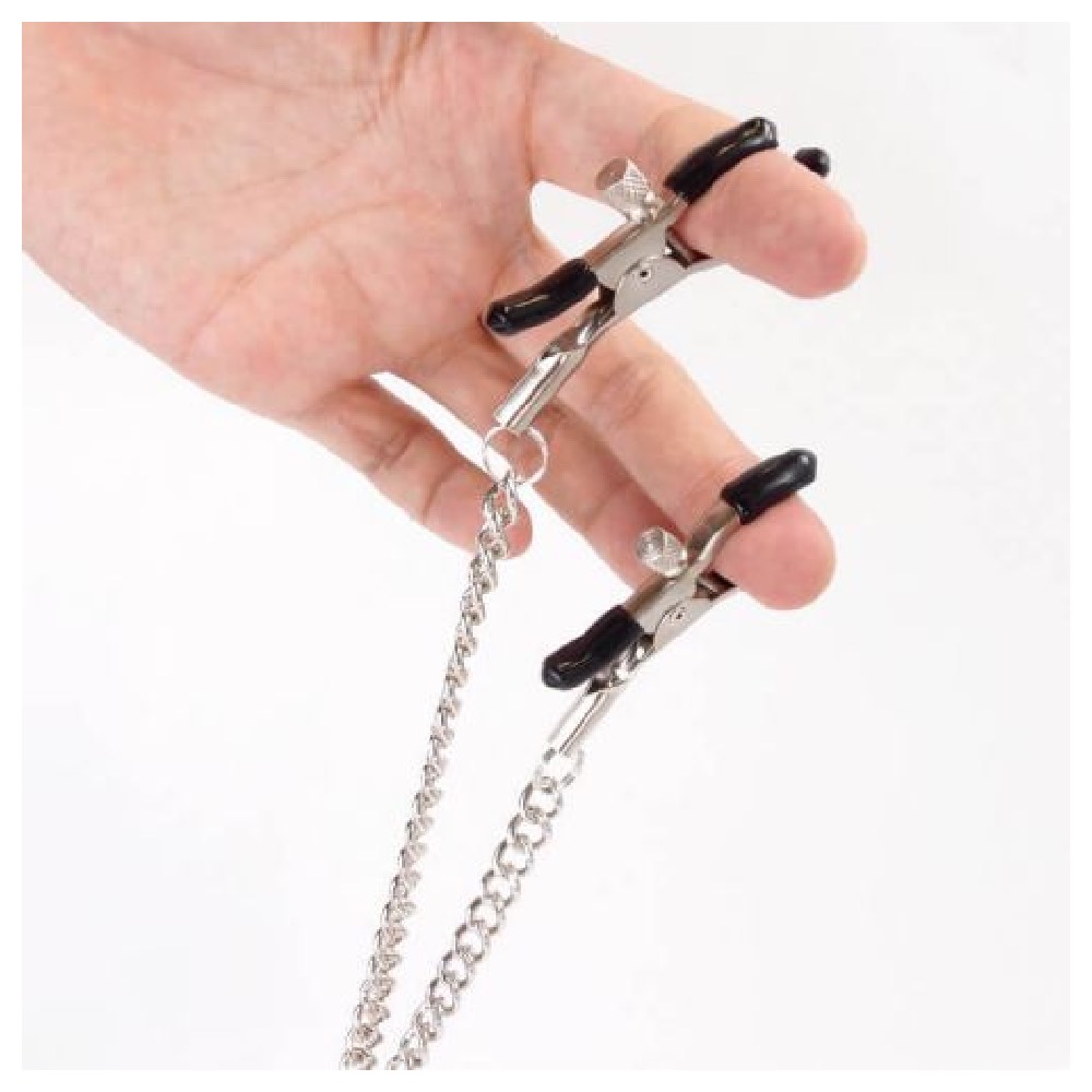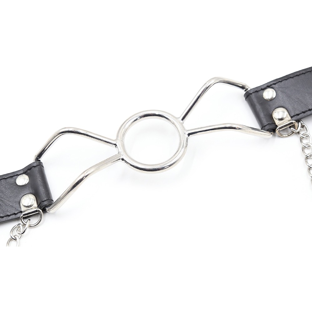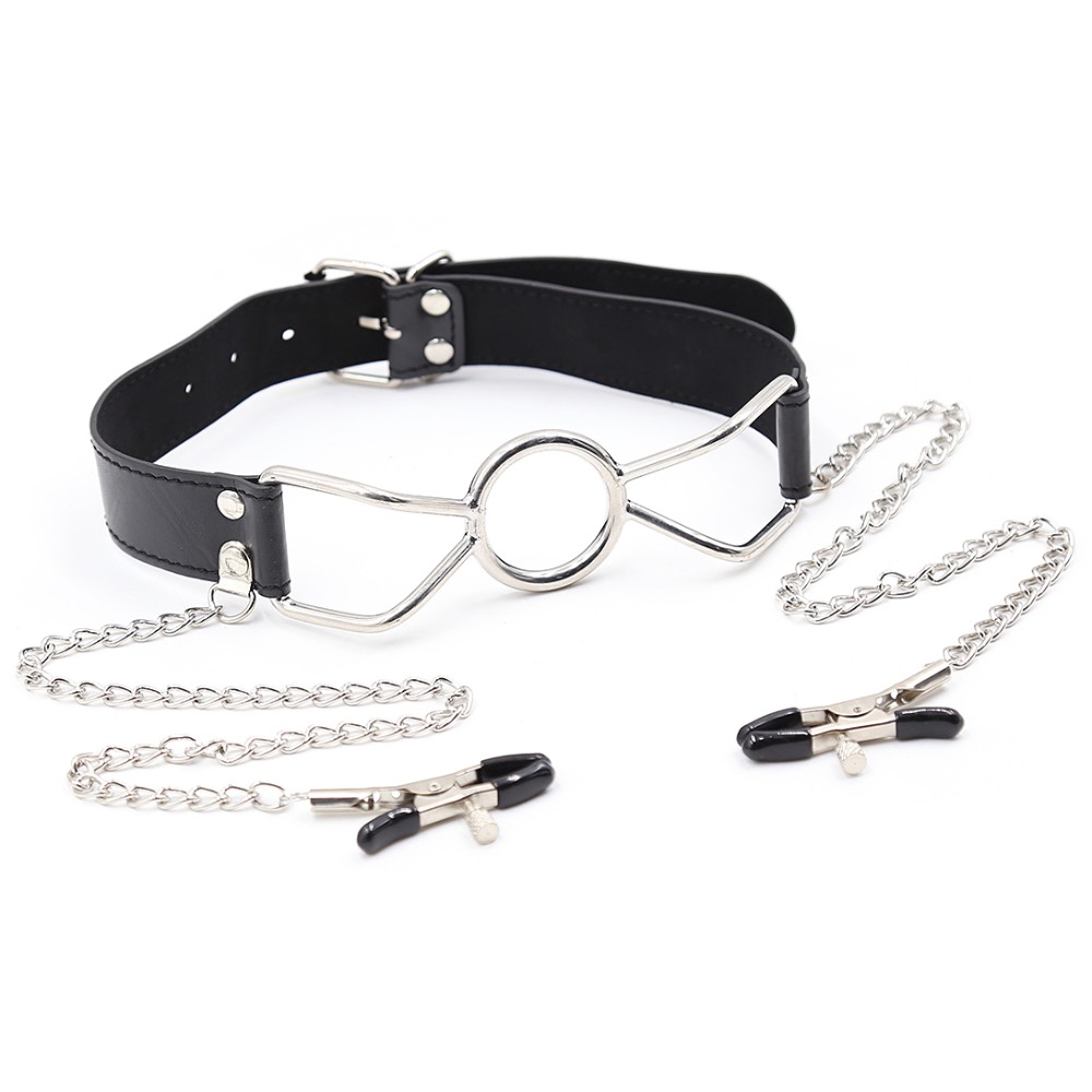 Naughty Toys large metal O-Ring Ø 4.5 cm with adjustable nipple clamps. High quality metallic mouth Gag for submissive Bondage games for him and for her! Bondage toy for those bedroom moments when wide-open isn t wide enough, then, Naughty Toys mouth Gag will get the job done! This extreme gag consists of a steel ring with chainned adjustable nipple clamps attached to the mouth gag strap. The gag prevent the mouth from closing, leaving your subject s mouth wide open for whatever you wish to put in it.