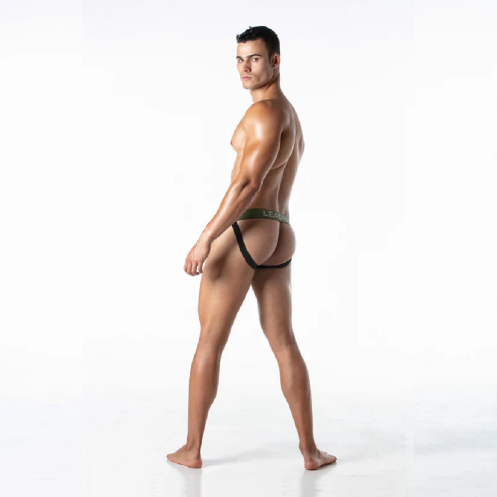 White colour jockstrap in an elasticated jersey ribbed cotton fabric. Double layer pouch for a secure feel. Brushed elastic jacquard waistband. Embossed LEADER logo in the black leg elastic