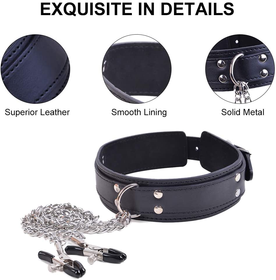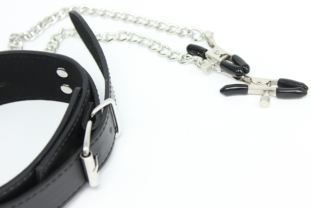 Naughty Toys Unisex Bdsm Bondage slave restraining adjustable Leather Neck collar with chained adjustable nipple clamps. This is a stylish Black fetish toy which combines a soft leathered Neck collar with a beautiful shade of silver chains ending up to a pair of adjustable pleasure nipple clamps!