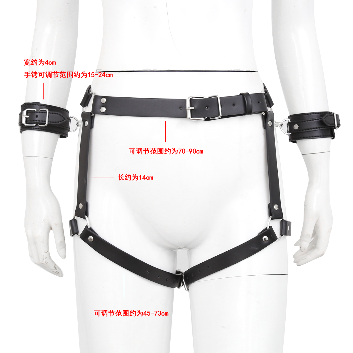 High quality faux leather waist and thigh harness with handcuffs by Naughty Toys. One size and adjustable. Cuffs are detouchable.