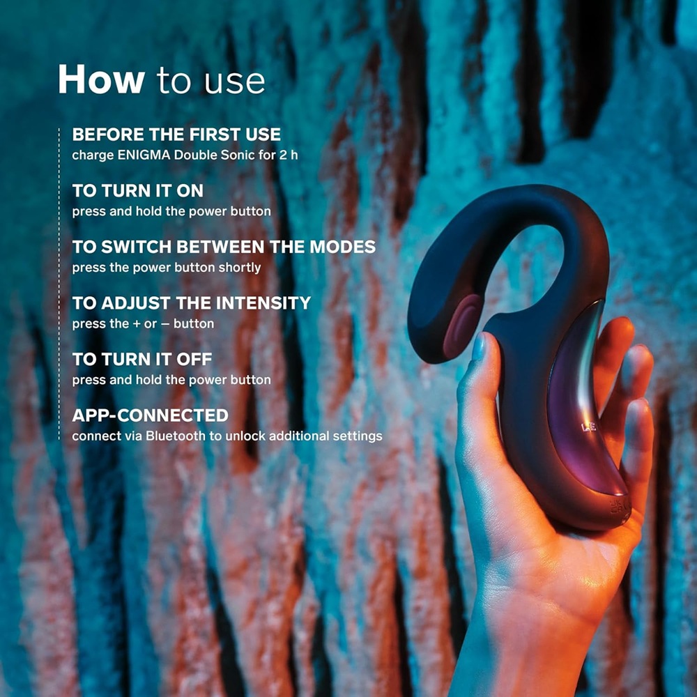 LELO Enigma Double Sonic Female Triple Stimulation Massager with Bluetooth App, 8 Pleasure Settings and 2 Extra Modes. ENIGMA™ Double Sonic features DeepSonic™ technology, specially developed to target the often neglected A-spot, just behind the G-spot, and uses powerful deep sonic waves. On top of that, ENIGMA™ Double Sonic offers sonic wave stimulation on the clitoris, as well as vibrating sensations to the G-spot.