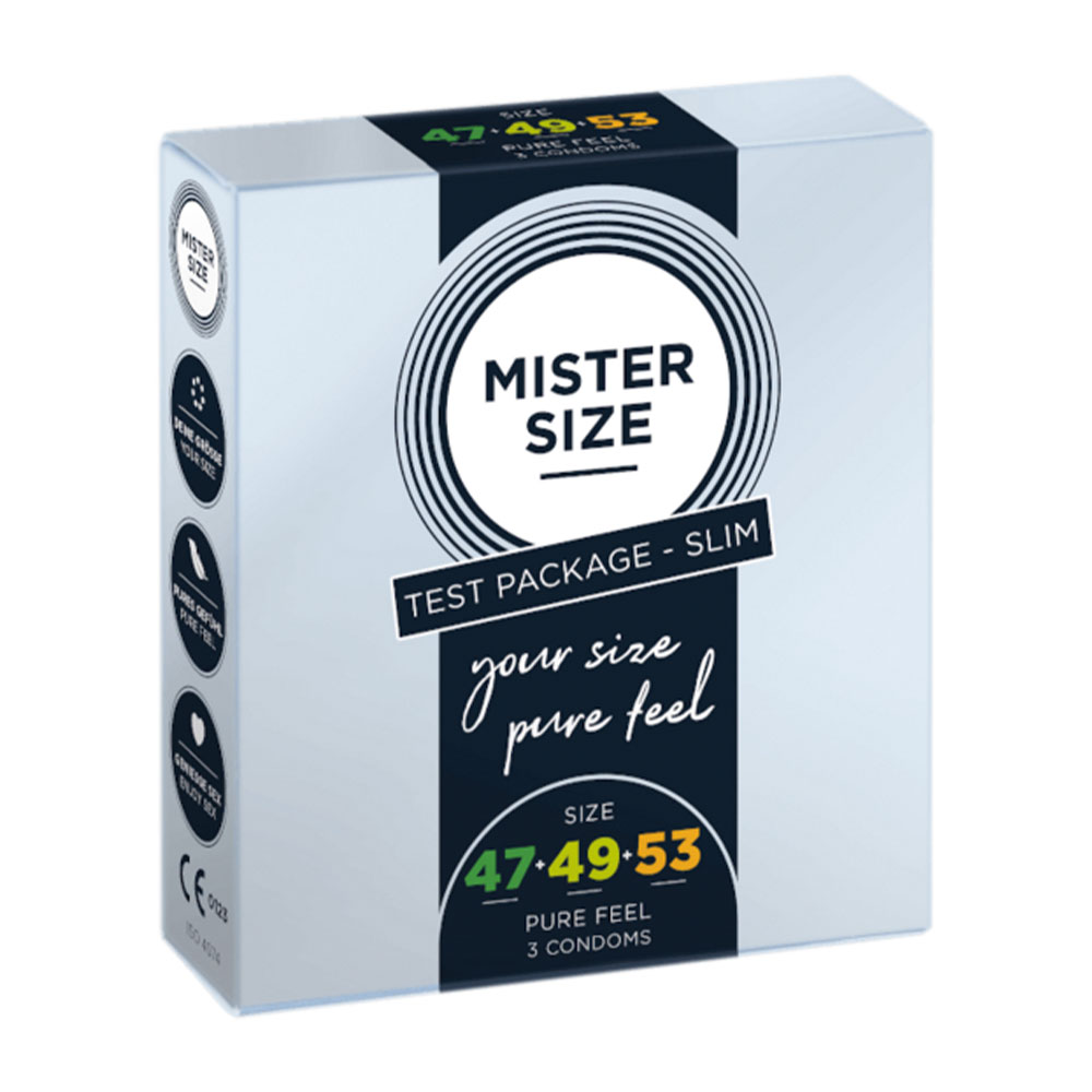 With a total of seven different condom sizes, MISTER SIZE helps you enjoy relaxed and good sex. The width ranges from 4.7 cm to 6.9 cm. (47-69 mm) You can find out which one fits best with one of the trial sets, for example.