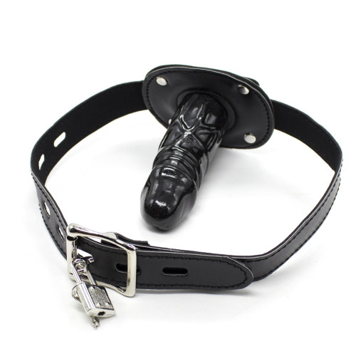 Silicone bondage mouth gag with dildo by Naughty Toys! One size and fully adjustable, face mask on one side and a dildo mouth gag from the other! A mouthpiece of Naughty Toys, made of durable black leather. On the inside, a sturdy bite silicone dildo 10 x Ø 3 cm for a good grip, to optimize this gag. On the outside a face mask. When your partner is busy doing other things…like doing you, you should be quiet and just keep moaning with pleasure.