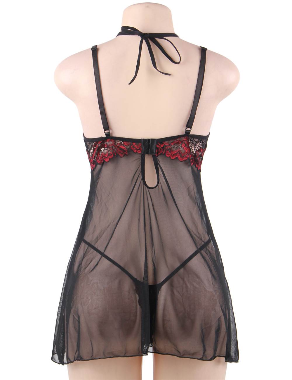 Black tulle chemise with floral lace cups and matching string to complete your evening look.