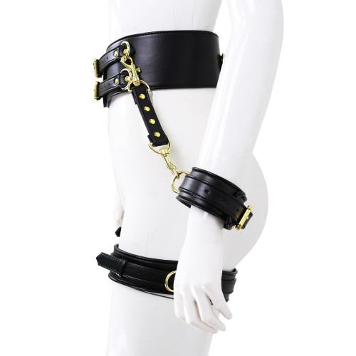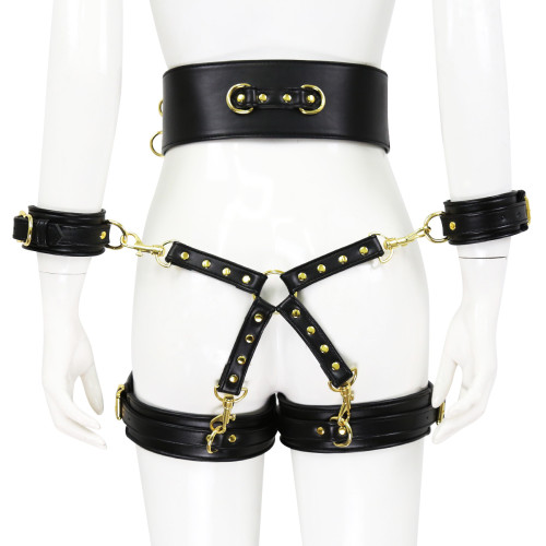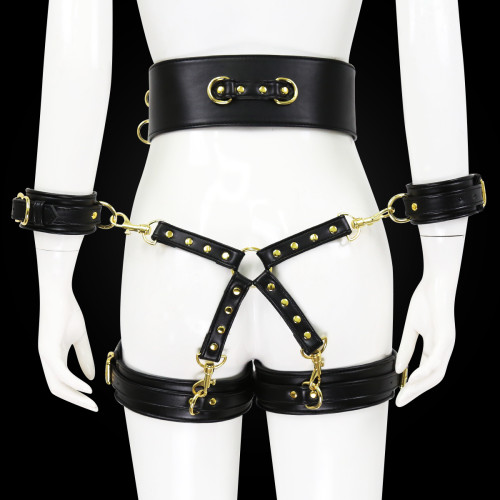 Fully adjustable, black leather with gold metal – bondage body waist corset with detouchable, matching set of wrist cuffs and thigh cuffs combined with a hog tie matching binder. Take your bdsm sex game to the next level.