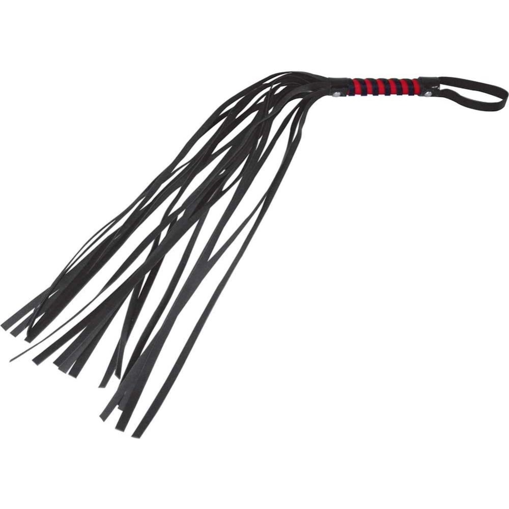 Magnificent Begginers soft leather Bondage flogger whip with red black stripes handle and 15 black tails by Naughty Toys. This entry level BDSM Flogger will defenetly amplify your Fetish intimate moments. Explore 50 shades of your dominant or submissive side with this Deluxe Naughty Toys Cat O Nine tails and your lover will know who is in charge. It Hurts and it feels so Good!