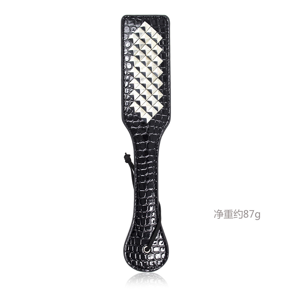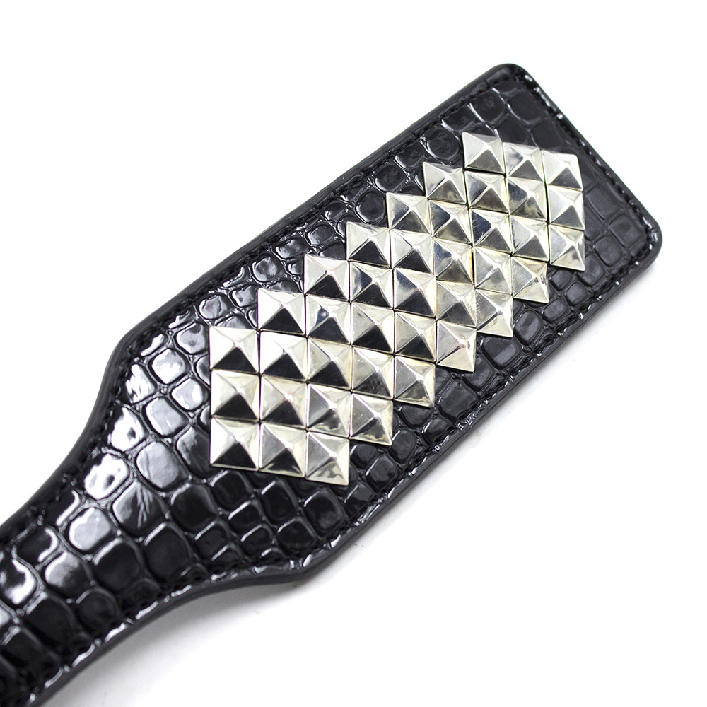 BDSM Bondage punishment spanking paddle whip slapper with silver rivets. Faux crocodile texture leather punishment paddle for all levels of spanking play. From very mild to extreme spanking level. The choice is up to you. Perfect for beginners who want audible impact without spanking too hard.