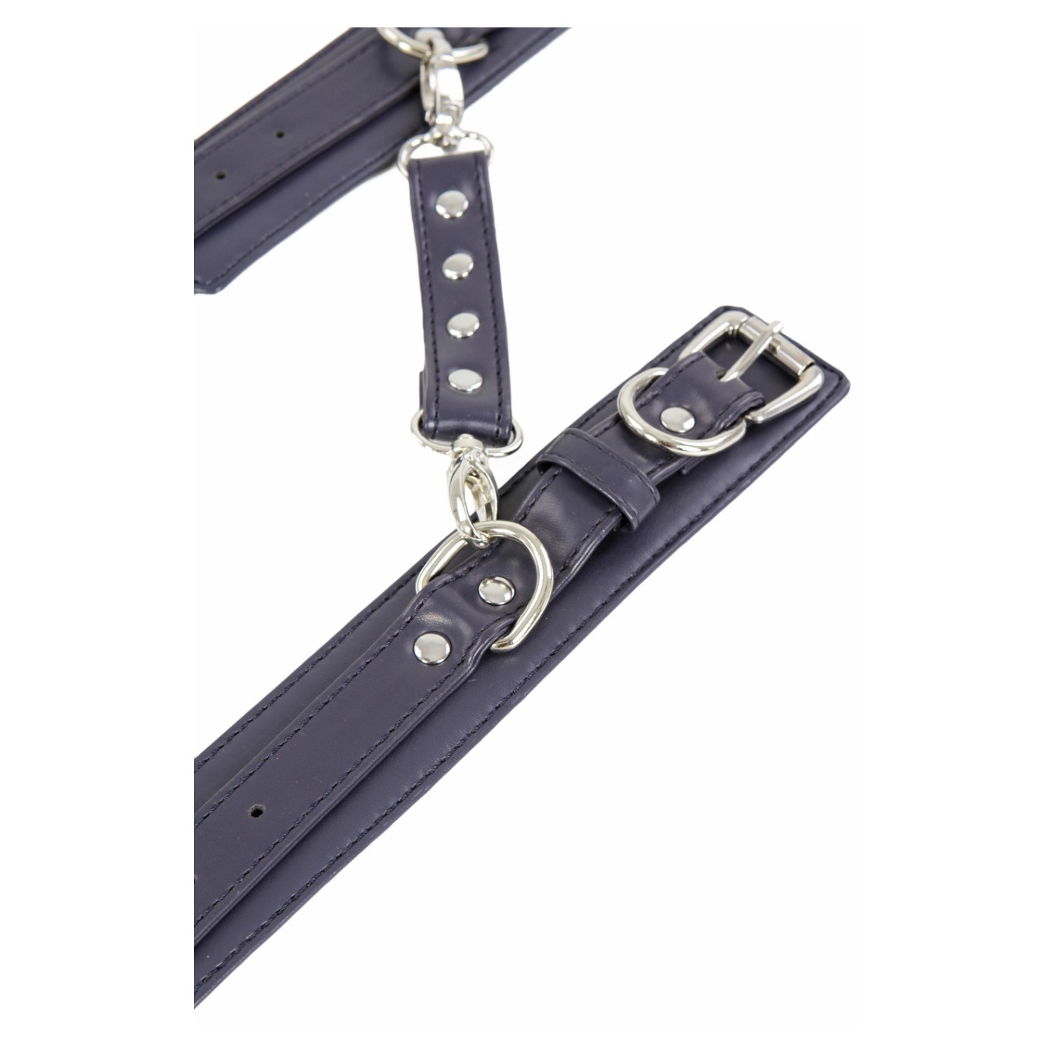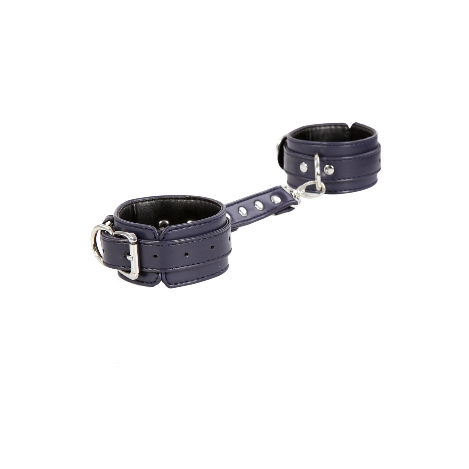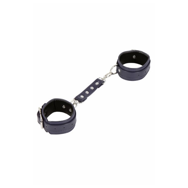 A beautiful pair of dark blue faux leather wrist restraints together with a matching silver snap-hook. One size, fully adjustable to fit on both genders. Made of quality materials to offer strength while in use by serious SM fetish players. Our slender style dark blue leather cuffs with silver hardware. The pretty silver contrasts beautifully with the deep, shiny blue of our classic leather bondage cuffs. With the strength of leather, 2cm width and quality hardware, these BDSM restraints will keep a tight and snug fit while offering flexibility around the wrists and ankles.