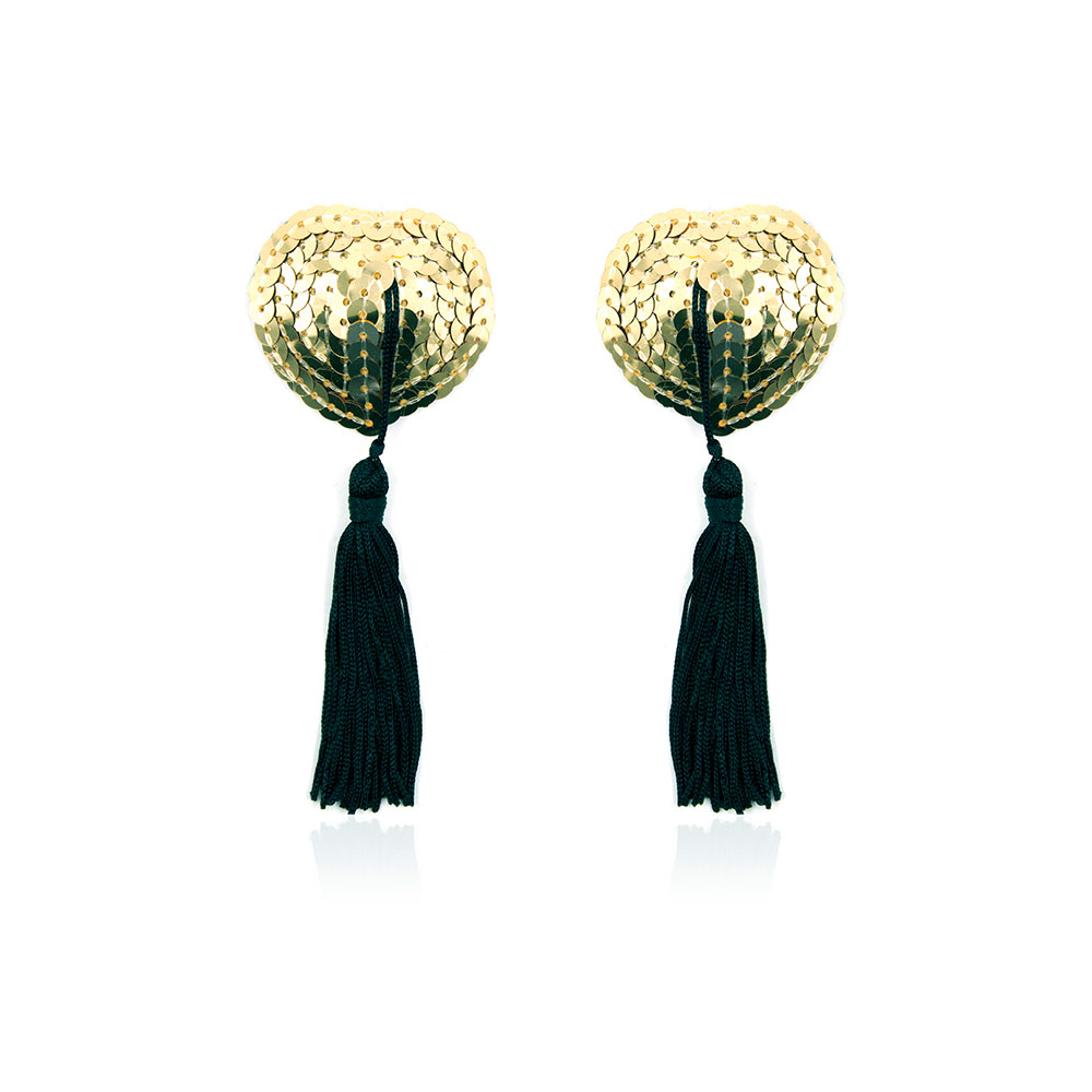 Give the glamorous look to your evening outfit or to your bedroom moments with the Naughty Toys Gold Burlesque Sequin Nipple Pasties. Gold sequins covered nipple cover with flirty tassels. This nipple cover will draw your lover attention to your breasts.