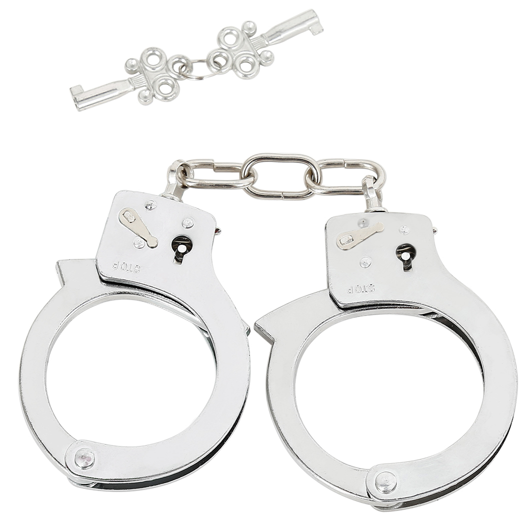Fetish bdsm bedroom games with strong and durable metallic Police hand cuffs. Semi heavy duty police hand cuffs to keep you in control over your submissive by NAUGHTY TOYS. Heavy (220 gr) silver plated BDSM handcuffs with a lock pair of keys. Unisex and Fully adjustable -adjusts exactly to the point and as tight, you want it to be. Offered with two keys (included).