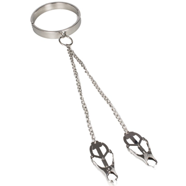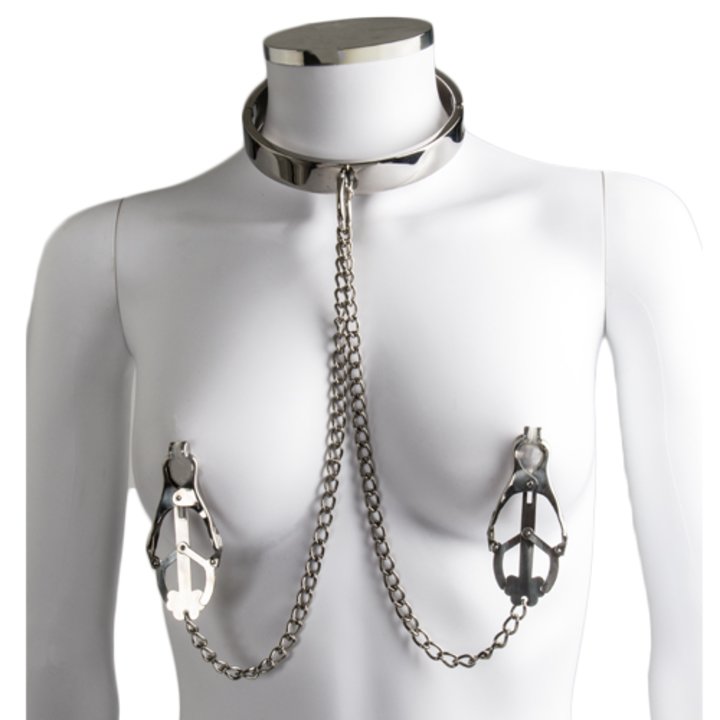 Create the ultimate fantasy and erase the boredom in your bedroom scene, grab our Metal Neck Collar With Clover Nipple Clamps now and start the wild game!