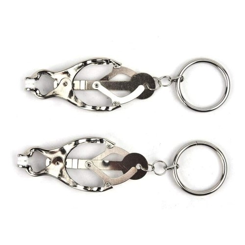 Enhance your intimate moments with the Naughty Toys O-ring Japanese Clover Nipple Clamps. Crafted for both comfort and pleasure, these elegant clamps are designed to provide a secure yet adjustable grip. Made from high-quality metal, they offer durability and a sleek, polished silver finish.