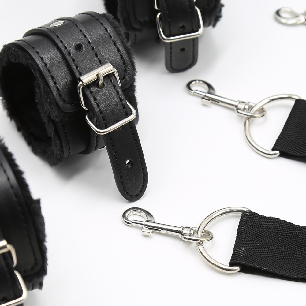 The NAUGHTY TOYS PVC Bed bondage wrist and ankles Restraints is a one size adjustable bed strap restraints, for sex Bondage and BDSM role games, together with a set of adjustable Wrist Handcuffs and Ankle Cuffs. Bind your partner to your bed by their wrists and ankles for instant bondage play. Handcuffs and ankle cuffs are covered with inner prodective furr.