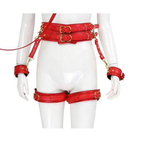 Fully adjustable, sexy red leather with gold metal – bondage body waist corset with detouchable, matching set of wrist cuffs and thigh cuffs combined with a hog tie matching binder. Take your bdsm sex game to the next level.