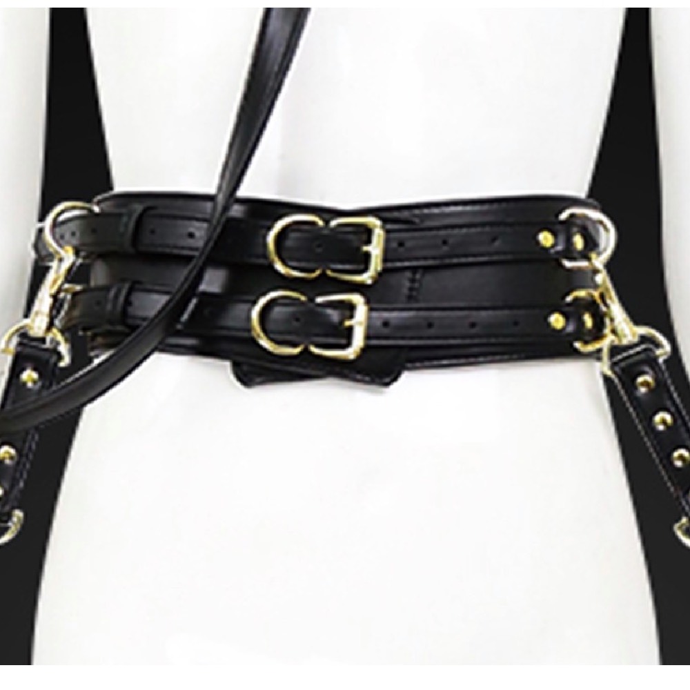 High quality imitation leather adjustable waist binding belt with gold details. Combine with your favourite collar, hand cuffs or hogtie.