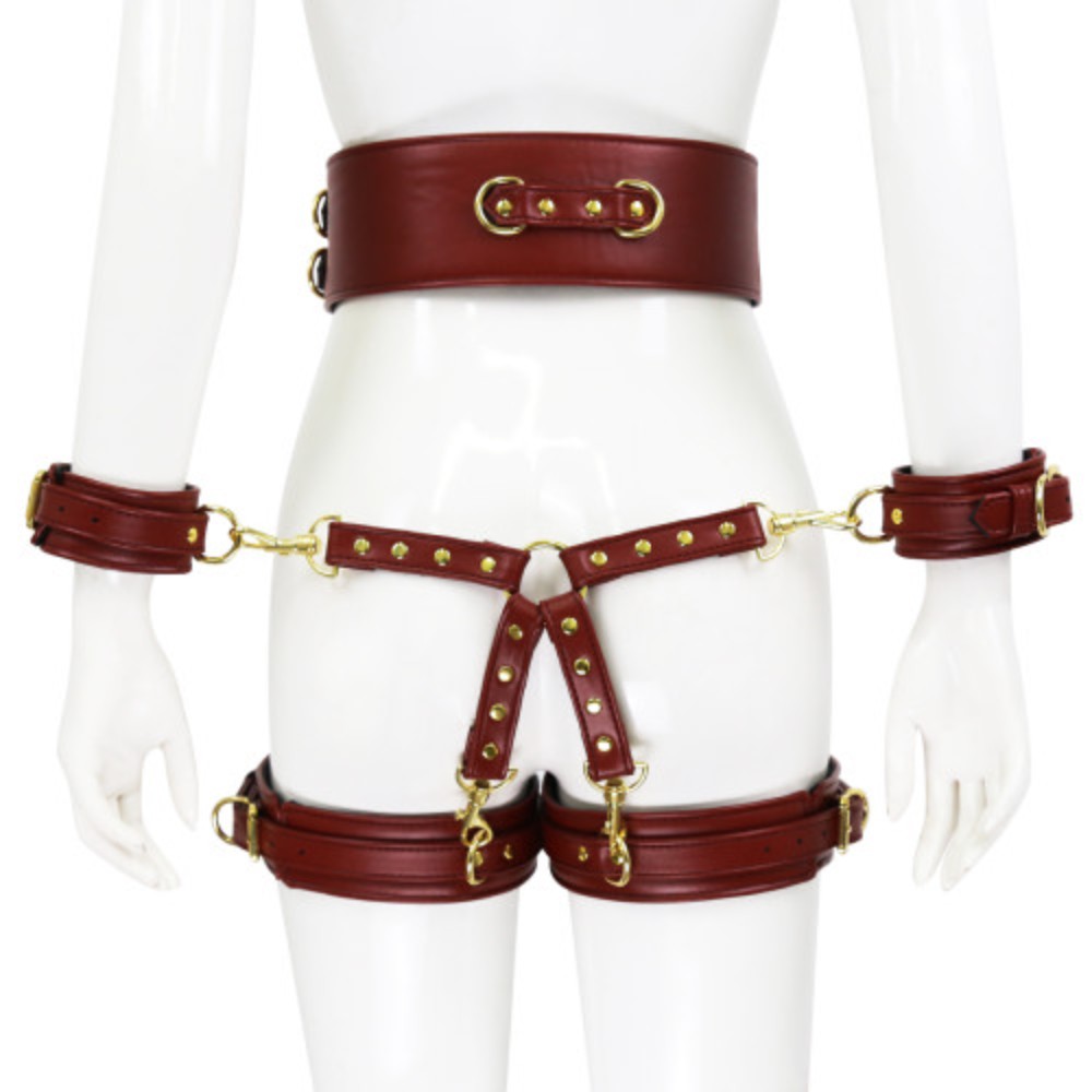 Fully adjustable, mysterious wine red leather with gold metal bindings – bondage body waist corset with detouchable, matching set of wrist cuffs and thigh cuffs combined with a hog tie matching binder. Take your bdsm sex game to the next level.