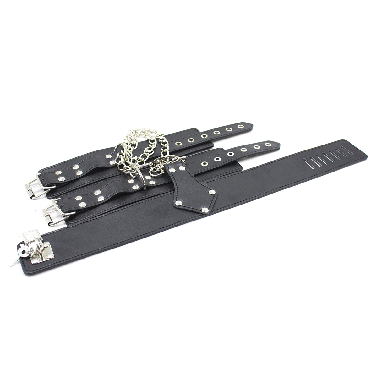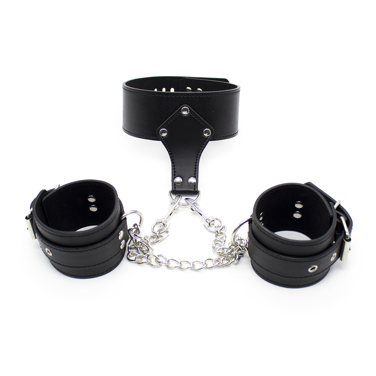 Quality BDSM Bondage set made out of PU Faux Black leather metal chained Handcuffs. Beginner to advanced Bdsm Dominance and slave submission bondage restraint Kit. This leather Studded Collar and handcuffs set gives you everything to need to keep your partner at bay, so you can have your way with them. Collar and cuffs connect with a metal chain. Please see photos.
