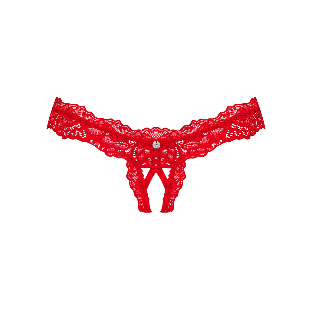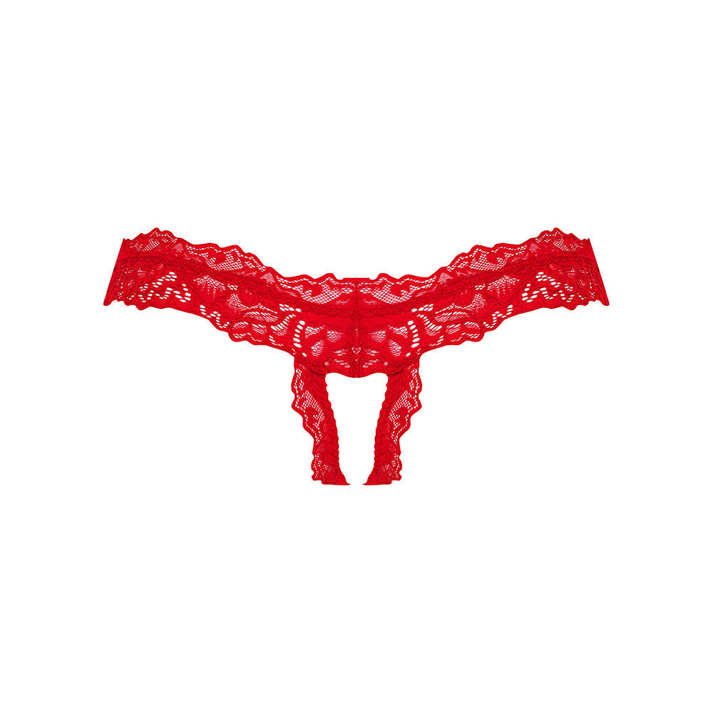 - Red, crotchless thong made of beautiful lace
