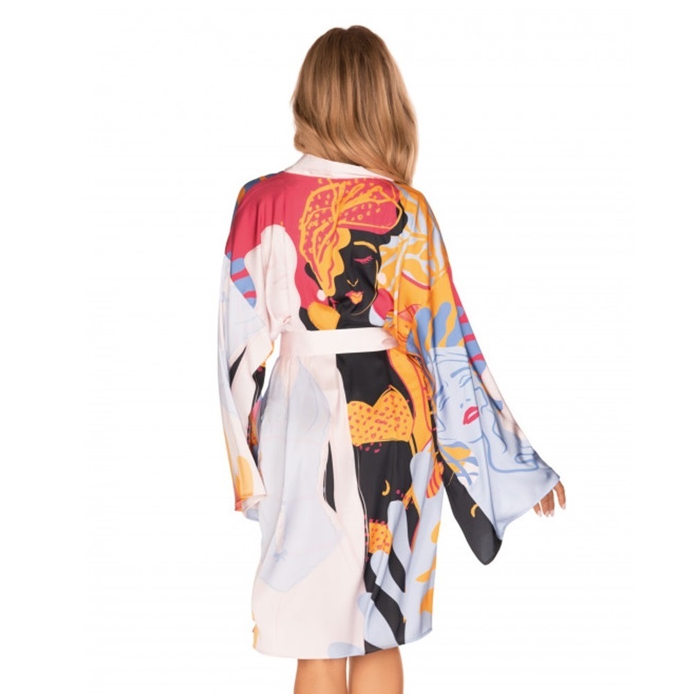 Discover the Allure of the Celenty Peignoir by Obsessive!!Step into elegance with the Celenty peignoir, designed with a sophisticated loose kimono cut and adorned with long, wide sleeves. The chic self-tie belt adds a touch of personalized elegance, ensuring a perfect fit every time. Crafted from stunning multicoloured fabric, it features an artistic depiction of three women in lingerie, making it a true work of art.Drape this exquisite piece over your bare skin for a captivating start to a romantic evening, or pair it with your favorite sexy lingerie to set the stage for an unforgettable night of passion. The Celenty peignoir is more than just loungewear; it’s an experience.Treat yourself or surprise a loved one with the perfect gift that promises luxury and enchantment.