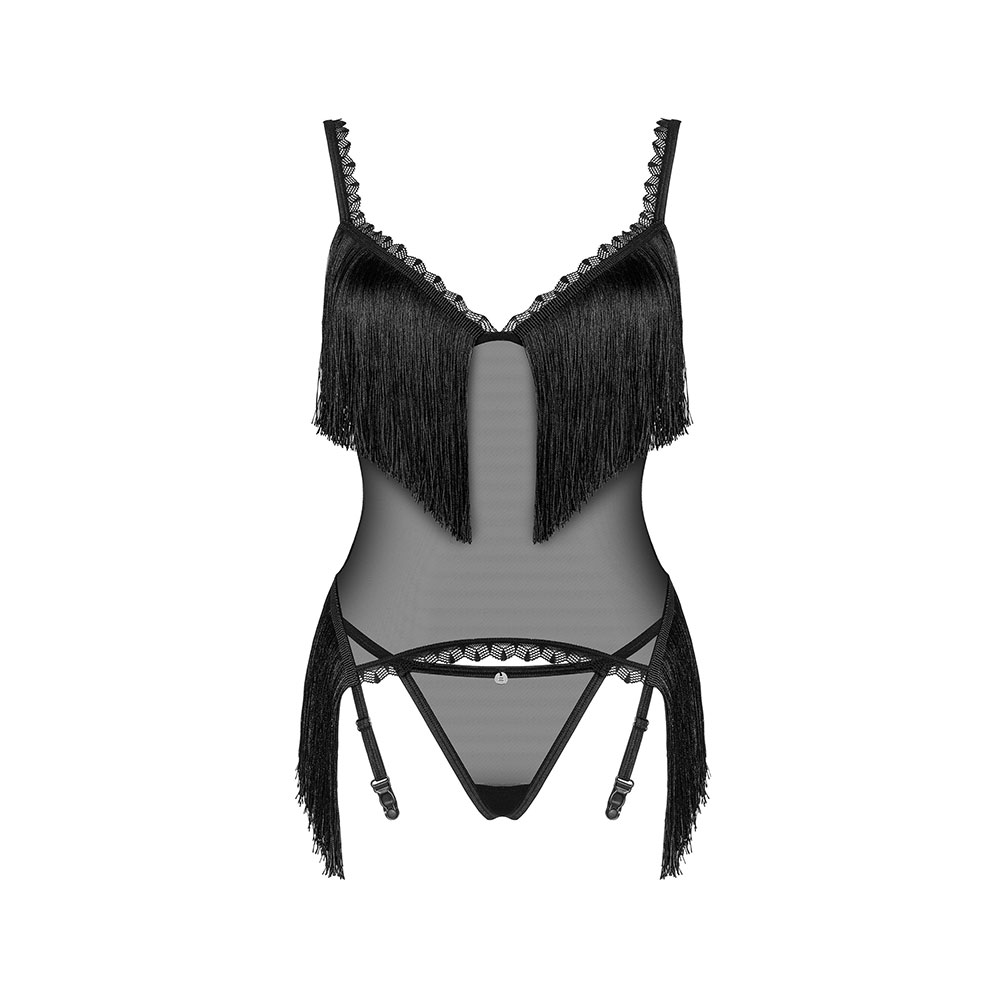 A short rundown on the Obsessive Sherila corset and thong Black: irresistible look, maximum self-confidence and temptation! Imagination-triggering details add an extra dose of spiciness – sexy garter belts, ultra-fine tassels covering the breasts and minimalist, lace trimmings. Delectable, translucent fabric fits snugly on your body with exquisite lightness, making you feel completely free to indulge in unforgettable moments…