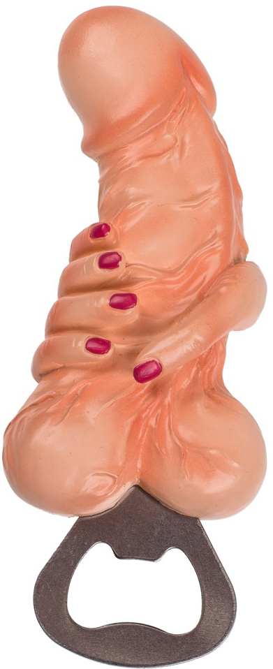 Metal bottle opener Willy + Hand from Out of the Blue with a penis that is firmly gripped by a hand with red fingernails. Very detailed design and carefully colored. With a practical magnet at the back to fix it to any metal surface (eg the fridge).