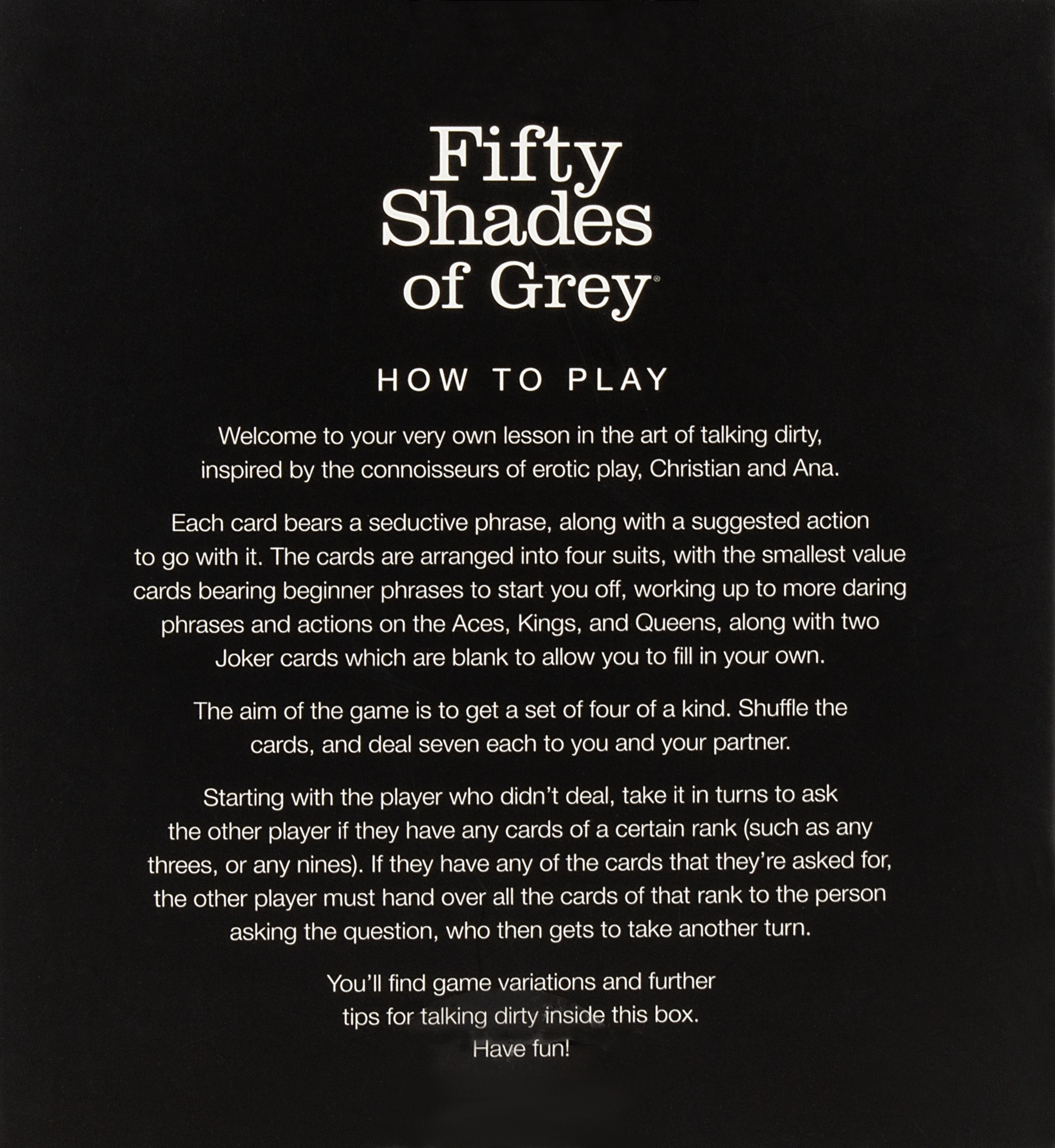 – Each card has a FSOG quote, dirty talk sentence & action