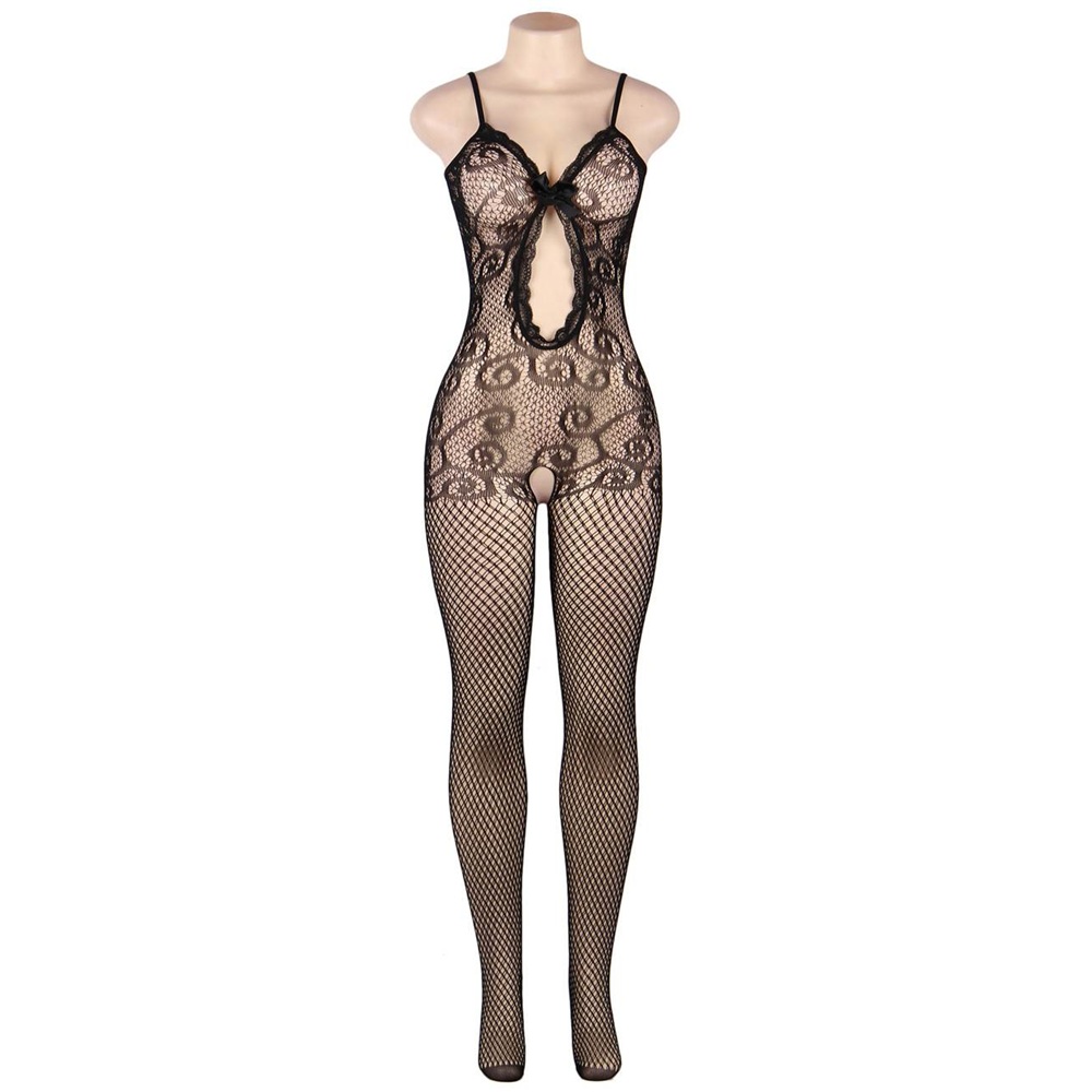 Turn heads and feel unstoppable in this strappy one-piece wonder, designed for those who embrace their playful side. The ornate lace-like bodice flows into sleek fishnet tights, creating a long, flattering frame finished with dainty lace edging and a sweet center bow. Made from a premium, high-tension nylon blend, it stays perfectly in place while remaining soft against the skin. Bold, breathable, and undeniably sexy, it’s the perfect high-impact addition to your late-night wardrobe.