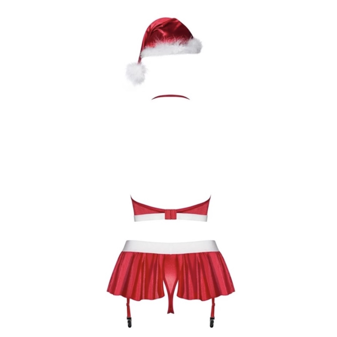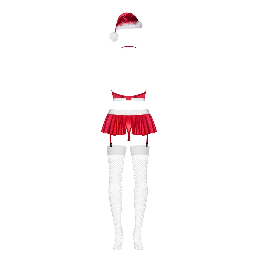 Become the gift this Christmas by slipping into this sexy and playful costume consisting of fun red skirt with matching thong, see-through white stockings, and a playful cap!