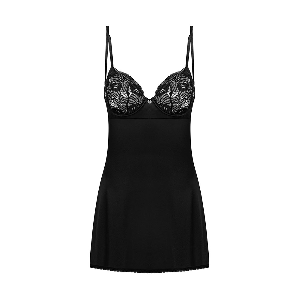 Plus size Obsessive Serena Love satin chemise and thong Black. The dazzling, satin beauty will captivate you at first sight. Floral lace and split straps nicely accentuate the bust and the cutout on the back is subtly tempting. Put it on for the evening and heat up the atmosphere in the bedroom!