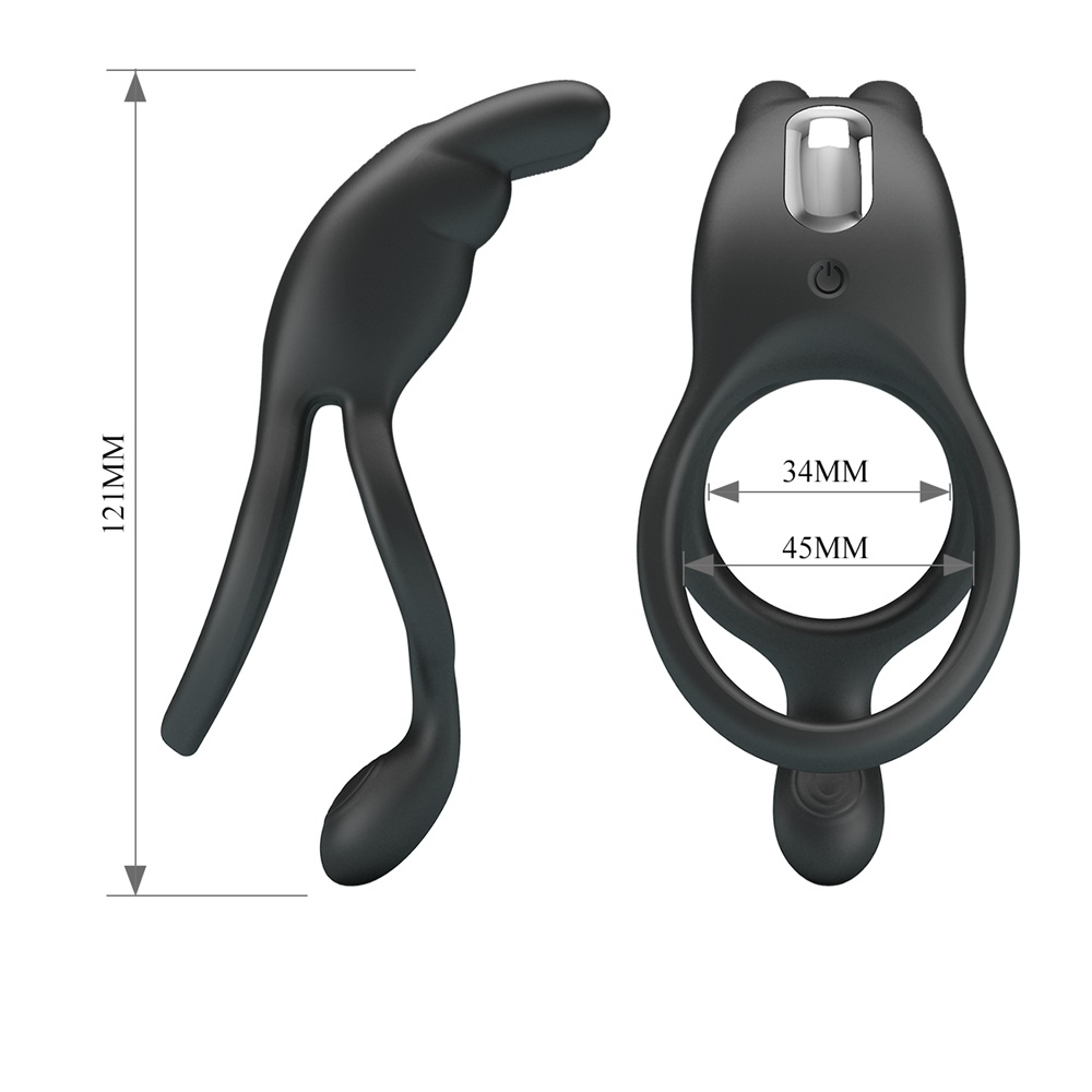 Pretty Love Seth Double Vibrating silicone rings with rabbit ears and seven (7) vibration settings. One size that fits most men, with soft and stretchy, body safe silicone. Two rings, one for the penis shaft and the other to embrace the testicles. Seth has got a memory function. An amazing cock and balls ring for hard and prolonged erection. This powerful male sex toy comes with a super powerful vibrator that stimulates the cock and clitoris. This cock ring makes the cock harder, and delays ejaculation while stimulating the cock and sends powerful vibrations to the clitoris for maximum satisfaction.